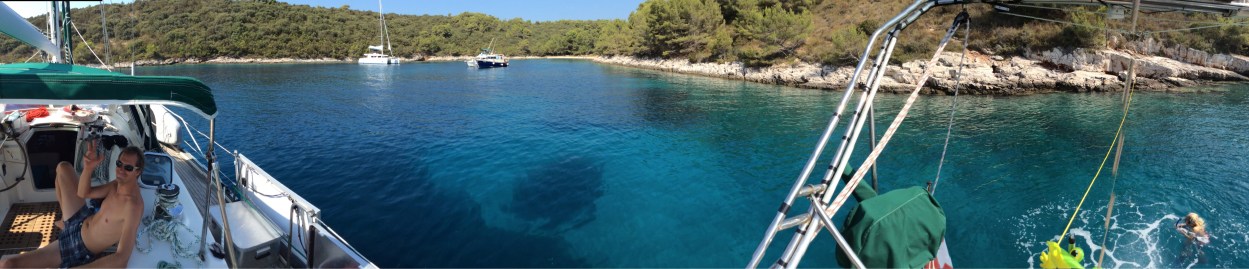 Erst nach dem Mittag brechen wir wieder auf. Wir konnten Internet erhaschen und das hielt mich in Trab. Ich konnte zum zweiten Mal die Seite aktualisieren, zum ersten Mal mit einem Text den ich unterwegs geschrieben hatte. Parallel dazu begleiteten wir die Kinder bei der ersten Deusch-Stunde. Wir freuen uns wenn sich dann das mit der «Schule» auch noch richtig eingependelt hat! Wir segeln bei perfekten 15 Knoten Wind südwärts, wieder hauptsächlich vor dem Wind mit Papillonbesegelung. Während der Fahrt, im eher offenen Meer, sag ich so daher, vielleicht sehen wir noch Delfine. Tatsächlich sahen wir einzwei Stunden später zwei Delfine die uns längere Zeit begleiteten! Wir übernachten in einer Bucht auf der Insel Scedro, mit ein paar wenigen anderen Yachten, mit einer Heckleine am Ufer an einem Felsen befestigt. (Das ist hier in Kroatien oft üblich. So haben viel mehr Yachten in einer Bucht platz, als wenn alle schwojen.)