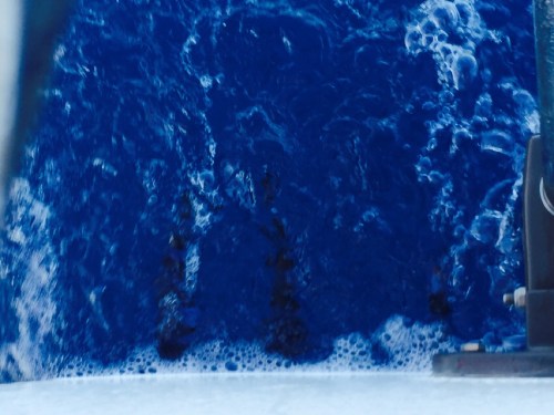 Um neun Uhr morgens hebten wir in Santa Maria di Leuca den Anker. Es ist motoren angesagt. Noch ist kein Wind. Die Prognosen sagen für die nächsten Tage generell weniger Wind, so war für uns klar dass wir so oder so aufbrechen werden. In dem ersten Drittel unserer Stecke war es immer ein hin und her mit motoren und segeln – unsere optimale Reisegeschwindigkeit wäre durchschnittlich 5 Knoten, dann kommen wir noch bei Tageslicht an unserem Zielpunkt Ciro Marina, an. Wenn wir also nur noch 3 Knoten oder weniger schnell sind, werfen wir dann wohl oder übel den Motor an. Während diesem hin und her, rief mich Kim mal nach hinten, ich war vorne am Bug, ich müsse schauen kommen: Keine Ahnung was er mir zeigen wollte, mir war gar nichts aufgefallen, hatte ich zwei grosse Fragezeichen in meinen Augen! Der Blick am Heck ins Wasser runter, war erstaunlich: Da hingen vier dick gestreifte Fischkörper (wie Meerkatzenschwänze) in unserem Fahrwasser…Waren wir in ein Netz gefahren? Nein, das konnte nicht sein, die Fische sahen aus wie geangelt und nach gezogen – oder, schwimmen diese in unserem Fahrwasser, frei mit? Es war lustig zu sehen und was auch noch spannend war, war dass unser Fishfinder dauern reklamierte, es sei zu wenig tief – bei 1000m Wassertiefe. Wir konnten dann das Rätsel mit der Unterwasserkamera lösen. Da waren nicht hunderte, sondern einfach die vier, von denen wir die Schwänze gesehen haben, die sich munter in unserem Kielwasser mitziehen liessen! Die Kamera im Wasser hielt sie auch nicht davon ab, wegzuschwimmen, sie wichen einfach ein bisschen aus und gaben Gas um wieder in der Welle mitgezogen zu werden!