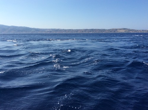 Auch in der Schweiz sei es noch immer Wetter wie im Hochsommer, haben wir erfahren. Wir haben auch um Mitternacht nicht mehr als ein TShirt an und sind oft in diesem um diese Zeit noch verschwitzt. Wir geniessen die Wärme, es ist toll. Es war ein wenig Wind gemeldet worden, doch der kreuzt unsere Zielpläne und kommt direkt auf die Nase. Wir sind nun nördlich unterwegs, Richtung Strasse von Messina. Die Meerenge ist stark befahren mit Frachtern und Fähren und zeigt auch je nach Ebbe oder Flut-Konstellation eine starke Stömung auf, je weiter wir zur engsten Stelle kommen. Wir hatten den richtigen Zeitpunkt gewählt und die Strömung sog uns regelrecht mit und aus der Meerenge hinaus! Es war ein Spektakel zu sehen, wie die Geschwindigkeitsanzeige immer höher kletterte, auf ein Höchtsmass von 11.4 Knoten, welche auf anderem Weg unerreichbar wären! Auch die Meeresoberfläche war faszinierend zu beobachten. Es gab Wirbel, kleine aufgestellte Wellen und grosse flache Stellen – eine grosse Aufruhr in den Wassermassen, wo auch unser Autopilot teilweise Mühe hatte den Kurs gerade zu halten. Ein spannender Augenblick den wir gerne in dieser Richtung erlebt haben und nicht umgekehrt – gegen den Strom!