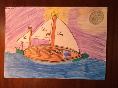 Um weiter zu reisen gab es für uns zwei Möglichkeiten, entweder dem Absatz entlang wieder nördlich «hinaufzuklettern» und auf der andern Seite wieder zurück oder: warten auf Wind und dann den Schlag (60sm) hinüber zur Mitte der Stiefelsohle zu segeln. Wir entschieden uns für diese Variante und somit ergab sich einen sehr ruhigen Ankertag. Nur einmal kurz waren wir am Land. Die Kinder schafften es danach drei-vier Stunden lang intensiv zu Zeichnen und dazu Hörbücher zu hören. Das ist auch eine Qualität (!) und es entstanden zwei wunderschöne Schiffszeichnungen!