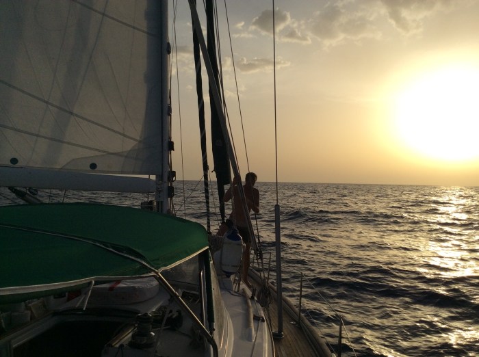 Der Start war wie befürchtet ein bisschen mühsam. Vorallem in anfangs Nacht war es ein hin und her mit den Segeln und keine Ruhe in Sicht und dann zu wenig Wind. So machen wir ein paar Seemeilen mit dem Motor. Nach Mitternacht schaffen wir dann einen perfekten Kurs durch die dunkle Nacht, bis am Morgen früh, zu fahren. Auch unsere Wachaufteilung funktionierte recht gut. Ich war bis um 2 Uhr wach, Kim löste mich bis um 4 Uhr ab, wonach ich dann wieder an der Reihe war und danach den Sonnenaufgang geniessen konnte! Zum Kaffee um acht waren wir dann beide wieder an Deck! Erstaunlich war dass wir fast die ganze Nacht keine anderen Schiffe gesehen haben ausser einem Containerfrachter und einem grossen Fischerboot und heute den ganzen Tag – kein einziges! Immer meinen unsere Augen etwas am Horizont zu erspähen aber es ist nichts, nur Meer, Meer, Meer.