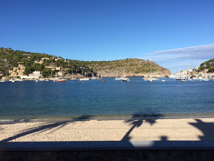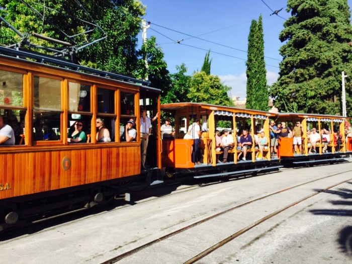 Der Ort heisst genau Port de Soller und liegt an einer grossen, gegen das Meer geschlossenen, blaugrünen Bucht, umschlossen von hohen Bergen. Genau hinter den Bergen liegt Palma de Mallorca und die beiden Städte sind mit einer (soviel wir wissen) antiken Eisenbahn, verbunden. Port de Soller und Soller sind mit eben einer solchen, antiken Strassenbahn verbunden. Wir haben vom Ankerplatz aus das Bähnchen alle halbe Stunde fahren sehen und es hat uns sehr gereizt, mit dieser zu fahren! So war am nächsten Tag der Plan, am Morgen mit der Strassenbahn nach Soller zu fahren und dann am späteren Nachmittag, weiter nach Ibiza zu segeln. Das haben wir dann so gemacht und war ein wunderbares Erlebnis. Soller ist eine herausgeputzte Stadt in der Senke vor dem grossen Bergmassiv und hat ein paar prächtige Bauten. Die Wanderung wieder zurück nach Port de Soller, Haziendas, Citrusgärten und Trockenmauern entlang, war für mich Seelenbalsam und wunderschön.