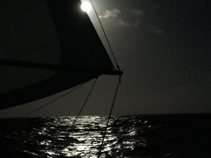 In den ersten Tagen gab es noch ein paar Mal ein Manövrieren mit den Segel. Oft kam der Wind gerade knapp zu sehr von der Seite, um mit unseren beiden Genuas (Passatsegel) fahren zu können. Das hiess, vorne auf dem Deck hantieren, Bäume weg und beide Segel zusammenfassen und auf die Seite ziehen. Und wieder zurück montieren, wenn der Wind wieder gut von hinten kommt. Unser ZIel ist es meistens nicht, solche Manöver in der Nacht machen zu müssen, doch in zwei Nächten waren wir im Flutlicht auf dem Vorderdeck, während dunkler Nacht am werken. Glänzende fliegende Fische wieder über Bord werfen, Schoten befestigen und lösen, sich auf dem tanzenden Schiff immer wieder festhaltend und ab und zu den Blick auf dunkle Wasser erhebend, den Wind spürend, dem ausserordentlichen Moment bewusst… um dann froh zu sein, wieder im schütztenden Cockpit zu sitzten.