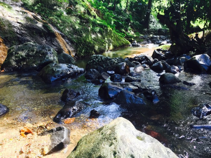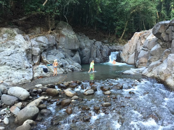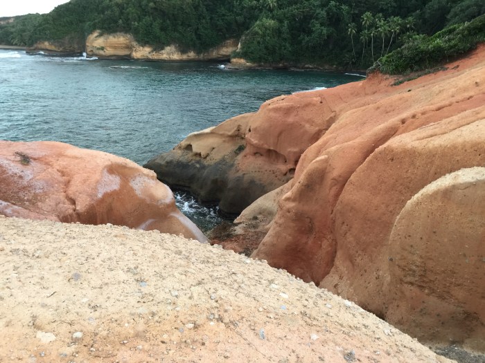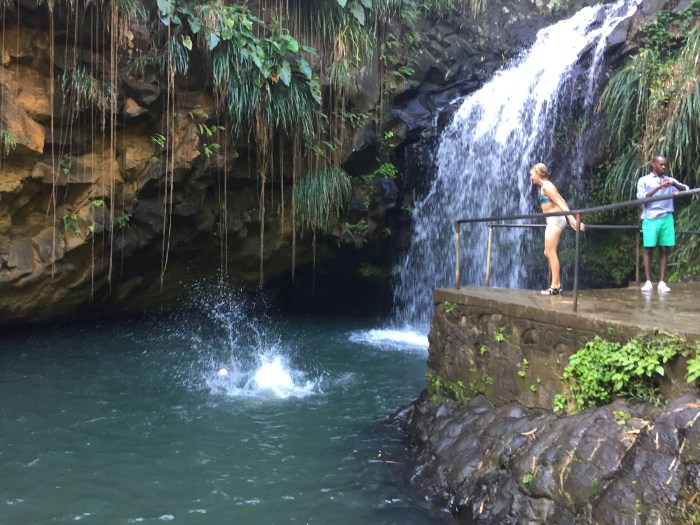 Wir haben dann unser Schiff noch ein bisschen weiter nördlich der Bucht, an ein schönerers Plätzchen, versetzt. Leider war wieder mal die ganze Bucht mit Seegras bewachsen – sehr schlecht für unser Anker. Doch Kim hat unter Wasser ein Loch gebuddelt und da zogen wir unseren Anker dann vorsichtig ein, was schlussendlich perfekt geklappt hatte. So konnten wir das Schiff entspannt vor Anker lassen und uns auf eine Entdeckungstour der Insel machen. Jemand von unserem Bekanntenkreis hatte mal sehr von der Schönheit dieser Insel geschwärmt, von der reichen Pflanzen- und Tierwelt, und so war ich sehr gespannt darauf. Wir fanden einen privaten Busfahrer der uns in ein paar Stunden wunderbare Flecken der nördlichen Insel zeigte. Wir konnten einen steilen Pfad durch den Urwald zu einem Fluss herunterklettern und dort im Wasserfall baden. Entdeckten Papageien, Geckos und spezielle Blumen und Pflanzen auf dem Weg und Krebse im Wasser. Wir hätten den ganzen Tag da verbringen können! Danach fuhr er uns noch zu einem Kap mit einem grossen, roten Sandsteinfelsen der vom Wasser rund ausgewaschen war und in einem der Spalten ein Rastafarai eine Gebetshöhle errichtet hatte – für mich wars ein wenig wie der Ayersrock in Australien!