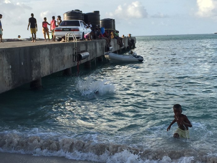 Der nächst Kurztrip führt uns in die Charleston Bay in Canouan. Das ist eine grosse Bucht mit (vermeintlich) sicherem Sandgrund, perfekt zum Ankern. Es hat einige Bojen die aber von einer Charterfirma vermietet werden und ein paar, aber nur ein paar Boote vor Anker. Ich bin eigentlich von der Bucht nicht so begeistert, ein bisschen langweilig kommt es mir vor. Nichts zum schnorcheln, das Wasser ist trüb vom Sand. Doch für eine Nacht spielt es keine Rolle. Wir machen einen kleine Ausflug ans Land. Wir wollen über den schmalen Pass auf die andere Seite der Insel wandern um dort ev. schnorcheln zu können. Unterwegs sahen wir freilebende Schildkröten in den Gärten und kläffende Hunde und ein trockenes Fussballfeld. Wie nun meistens erlebt, war die Atlantikseite sehr seicht und vom Pflanzen verschmutzt. Also wieder zurück. Auf unserer Seite gibt es zuhinterst, nach den Touristischen Hotelanlagen, wieder ein kleines Strandbeizchen der Einheimischen Bevölkerung. Der davon liegende Betonpier wird von spielenden Kindern und Jugendlichen als Sprungturm benutzt. Es herrschte ein fröhliches Treiben und mittendrinn zwei blonde Mädels! Lustig war auch zu beobachten wie die kleineren Kindern von den ältern Geschwistern betreut wurden – zum Teil sehr unsentimental aber trotzdem herzlich! Als ein kleines Mädchen einem kleinen Jungen, der immer in wehrloses Weinen ausbrach wenn jemand ihm Sand anwarf, diesem Jungen zum Ärgern wieder mit Sand bewarf, musste auch eine Mutter, die wie ich dem Treiben amüsiert zuschaute, Schmunzeln, wir waren uns einig: Es ist überall das Selbe, Kinder – Menschen!