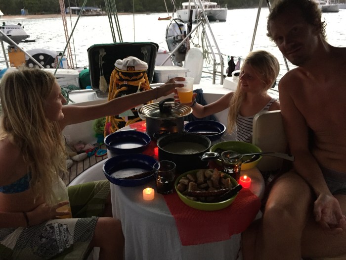 Wir machten mit «Sea Quark» ab, noch ein paar Tage vor Anker zu gehen, bevor wir dann Richtung Panama aufbrechen. Wir trafen uns am uns bekannten Ankerplatz in Illes de Gosier wieder und hatten da nocheinmal so richtig eine innig gute Zeit zusammen! Die Kinder genossen ihre Gesellschaft auch und lernten mit Ihnen richtig gut Englisch sprechen. Camilla fungierte an zwei Tagen auch als Lehrerin – am liebsten hätten wir sie behalten! Nach vielen «Jokes» (Witzen) zwischen Nowak und Kim, der letzte war eine grosse Muschel die Kim in einer nächtlichen Tauchaktion an Nowaks Schiff am Anker befestigt hatte – nahmen wir dann am 28. Januar definitv für mehrere Jahre von den beiden Abschied. Sie werden noch ihre Zeit in der Karibik geniessen und dann wieder nordwärts segeln. Und wir namen an diesem Mittag Kurs nach Panama!