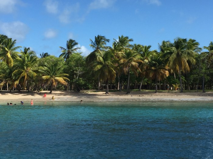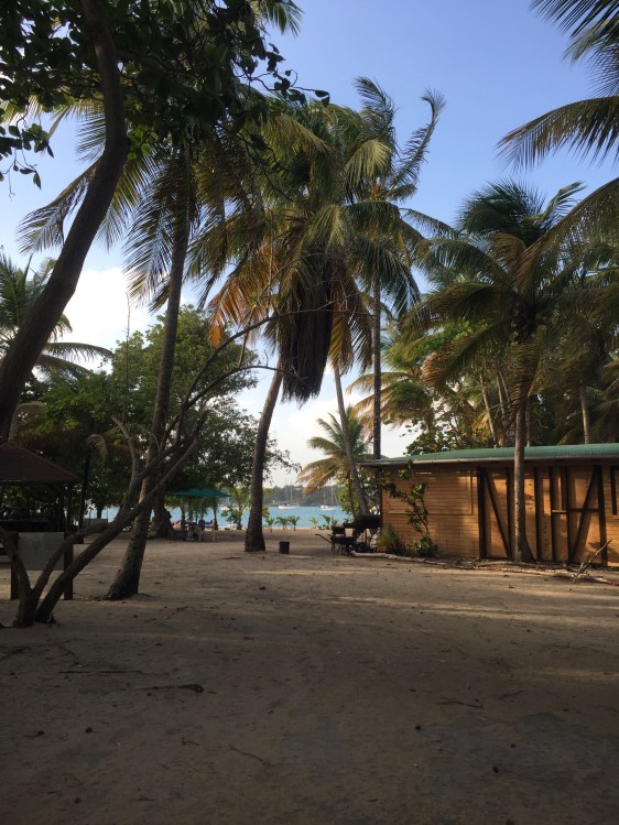 Wir laufen bei immer noch viel Wind aus, es ist ein bewölkter Tag mit vielen Squalls. Ein solcher tobt sich auch gerade über uns aus, als wir uns kurz vor unserer ausgewählten Bucht befinden. Bei diesem starken Regenguss können wir kaum ein paar Meter weit sehen, also wenden wir und fahren wieder ein Stück zurück. Doch glücklicherweise sind diese Squall-Ungeheuer immer wieder schnell vorbei und so können wir es kurz darauf doch wagen, in die Bucht hineinzufahren. Das Meer ist recht unruhig und es hat auch hier wie überall in der Karibik, einige Untiefen. Aber wir wollen unbedingt in die Bucht hineinfahren – es sieht so verheissungsvoll aus! Eine Bucht wie von einer Postkarte und die perfekte Weihnachtsbucht! Nach unserem Ankerabenteuer sind wir auch froh um die Boje, an der wir dann festmachen konnten. Unterdessen schien auch wieder die Sonne und die Palmenbestückte Traumbucht erschien in ihrer vollsten Schönheit! Es gibt einen hellgelben Muschelsandstrand, ein schmales Stück grün bewachsene Fläche und dahinter sah man das blau-türkisfarbene Meer, mit den weissen Schaumkronen der Wellen von der Atlantikseite. Prächtig. Somit war die Kulisse für den Weihnachtsabend perfekt und unsere Nerven konnten sich wieder beruhigen 🙂