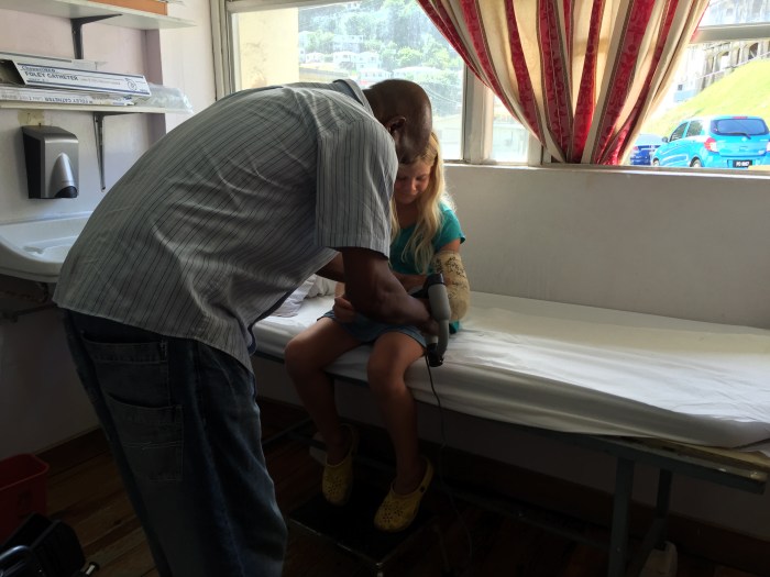 Am 9. 12. 2015 sind genau sechs Wochen vergangen seit Neeles Unfall. Eine Dame der ARC Crew die aus St. Lucia stammt, hat für uns Abklärungen gemacht, in welchem Spital Neele am besten den Gips entfernen kann. Übrig blieb nur das St. Victoria Hospital, eines der älteren Spitälern und ein Staatliches, da die anderen Privatspitäler nur weiche Verbände und keine Hart-Verbände, wie Neele einen hatte, entfernen könnten. Jedenfalls wurde so uns gesagt. Wir sollten am Morgen um 8 bei der Notaufnahme erscheinen, mit den Unterlagen, Röntgenbilder ect. Mir war dieser Termin die ganze Zeit ein Dorn im Auge und ich hatte so meine Befürchtungen.