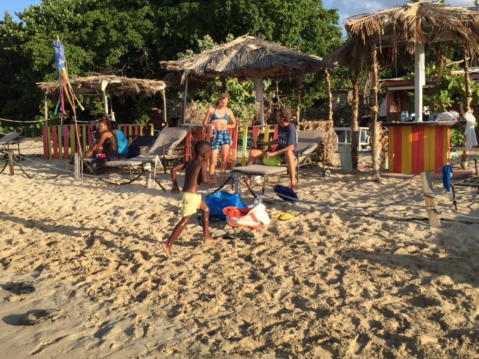 Als wir dann mit den Arbeiten im Hafen fertig waren, machten wir uns auf die Umgebung auszukundschaften. Wir probierten zum ersten Mal unseren grossen Dinghimotor aus. Dieser ist enorm schwer und wir müssen uns gut überlegen wie wir diesen in die Hände nehmen. Aber wenn er mal montiert ist, können wir so richtig schnell und weit fahren! Wir fahren aus dem Hafen heraus und an das hinterste Ende des langen Sandstrandes. Dort ist eine kleine Hütte, eine Strandbar mit einer ältern dicken Mama, der Miss Marie, hinter der Theke. Und das klassische Bild mit dem Baum am Ufer und den Einheimischen die darunter sitzen. Gemütlich! Wir kommen mir den Gästen ins Gespräch, mit Einheimischen und Touristen, probieren Miss Maries Erdnussrum und essen das von ihr auf dem Feuer frisch gebackene Brot mit Käse gefüllt. Lenja ist mit Neele solidarisch und spielt mit ihr im Sand, anstatt ins Wasser zu gehen und wir schwimmen endlich im warmen, karibischen Wasser! Am nächsten und übernächsten Tag machten wir uns nochmals zu diesem einheimischen Strandabschnitt auf. Der Rest des Strandes ist mit Restaurants und Hotels verbaut. Wir probierten Miss Maries auf dem Feuer gekochtes Mittagessen: Gebratene Pouletstücke mit Reis, Kochbananen und Brotfrucht. Dazu eine scharfe, süssaure Sauce. Nach ca. einer Stunde Wartezeit mit knurrendem Magen war diese Mahlzeit besonders gut! Und irgendwie war es auch gut zu sehen wie da in einer Seelenruhe gewerkelt wird, ohne Hektik, ohne Eile.