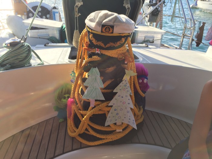 Der Abend wurde dann von den Kindern als «die schönsten Weihnachten überhaupt» bezeichnet. Und es war wirklich schön: Wir hatten einen Weihnachtsbaum (ganz kreativ von Kim aus Seilen und einem Fender gebaut!) hörten eine Weihnachtsgeschichte, assen Fondue (!) mit gegrillten Würstchen und lauwarmer Schokoladekuchen zum Dessert. Die Kinder bekamen beide ein grosses Bodysurfbrett, welche wir erstaunlicherweise so verstecken konnten, dass die Beiden diese nicht vorher entdeckten! So war die Überraschung gross! Die Kinder hatten sich auch ins Zeug gelegt, uns ein Weihnachtsgeschenk zu basteln. So bekam ich von Lenja ein selbstgeknüpftes Glücksband in den Regenbogenfarben und Kim auch ein geknüpftes Band mit Korkenstücke daran, als unsinkbarer Schlüsselanhänger! Sehr praktisch! Neele hatte aus meinem Schrank ein T-Shirt stibizt 🙂 dass sie dann bemalte und dazu ein Kärtchen geschrieben und gezeichnet. Das haben sie gut gemacht und hat uns gefreut! So hatten wir wirklich einen schöne, einzigartigen Weihnachtsabend verbracht.