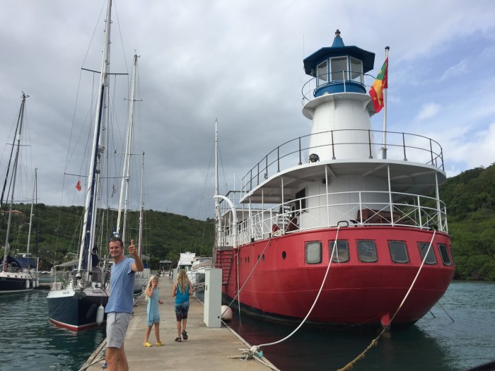 Die Weiterfahrt geht südlich um die Insel herum. Gegen den Wind und vorallem gegen die Atlantikwellen. Unser Motor muss heftig arbeiten und wir kommen wie erwartet schwer voran. Grenada hat im Süden der Insel viele Fjorde die dich beieinander liegen. In einem dieser tiefen Einschnitte liegt die Schweizer Marina «le Phare bleu». Eine bekannte Fernsehmoderatorin baute diese vor 8 Jahren mit ihrem Partner hier auf und sind immer noch hier. Es gab vor einigen Jahren eine spannende Fernsehdokumentation über den Aufbau, den Kim und ich gemeinsam geschaut hatten. Nun wollten wir uns einen eigenen Augenschein nehmen, wenn wir schon mal hier sind! Das Markenzeichen der Marina ist ein rotes Leuchtturmschiff, dass sie aus dem hohen Norden hierher verschifft hatten. Früher war das Office darin beherbergt, heute gibt es ein kleines Museum und die Duschen darin. Hinter der Marina gibt es ein Resort mit kleine Häuschen. Nirgendwo in der Karibik habe ich einen so schönen, gepflegten tropischen Garten gesehen wie da. Grosse eiserne Kübel mit blühenden Seerosen darin, waren das Highligt. Aber auch die Restaurantanlage war sehr schön gestaltet. Und am Morgen assen wir das feinste, noch warme Brot aus dem Shop! Doch einen Tag ist genug, die Marinas in Grenada sind nicht gerade billig, das Wasser ist aufgetankt und die Batterien voll geladen, das Marina WiFi genutzt um Kindle Bücher herunterzuladen… Wir waren bereit zum Weiterfahren.