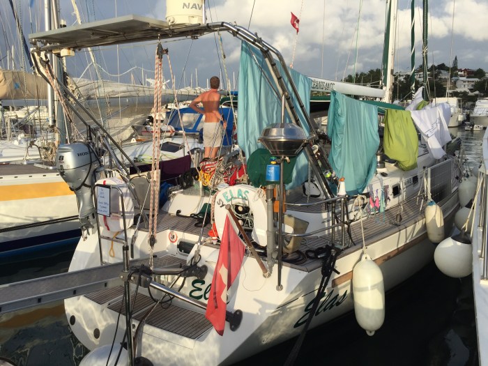 Die nächsten Tage genossen wir die Ruhe des stillstehenden Schiffes, putzten, füllten Wasser nach, liessen die Kleider waschen und erfreuten uns an der karibischen Wärme und Atmosphäre! Nach und nach kamen weiter Boote herein und wir halfen mit, diese gebührend zu Begrüssen! Wir hatten die lauteste und schönste Hupe weit und breit! Viele Schiffe hatten Schäden nach nach der Überfahrt vorzuweisen. Die meisten waren passiert, als diejenigen von Squalls (Gewitterwolken) überrascht worden sind. Es wurden einige Spinnakerbäume gebrochen, Haken für den Parasailor aus dem Polyester ausgerissen, Vorstag gebrochen, oder auch Wassereinbrüche durch das Ruder, Motorenprobleme und Probleme mit dem Autopiloten. Ein ganzes Sammelsurium an Dingen die bei Booten so kaputt gehen können! Wir mussten zum Glück nur ein durchgescheuertes Seil ersetzen. Und doch ist es auch gut zu sehen was so alles passieren kann. Es gibt uns die Erfahrung, vorzusorgen und aufzupassen.