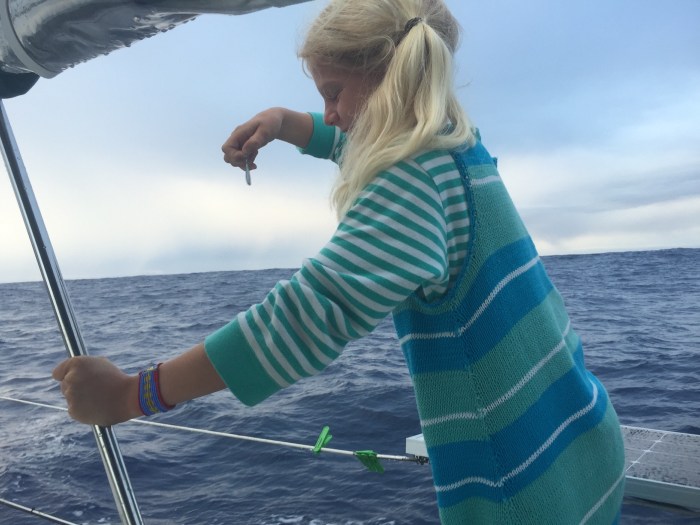 Wir sind ja vor eineinhalb Wochen zusammen mit «Blue Raven» abgefahren. Wir konnten ihr Licht vom Topmast noch ca, zwei Nächte lang vor uns sehen, dann waren sie weg. Auch über Funk schon bald ausser Reichweite. Die Kinder haben mal noch zusammen ein paar Stunden ein Spiel gespielt – Schiffe versenken – über Funk. Dann waren wir alleine. Es ist leider ein Ding der Unmöglichkeit, bei einer solchen Strecke beieinander zu bleiben. Ein bisschen wehmütig war es zu Beginn. Doch dann tauchte plötzlich ein anderes Schiff, 5sm neben uns, auf dem AIS auf! Und es war die «KRISTIANE». Wir hatten die Beiden älteren Leute auf San Cristobal kennengelernt. Wir freuten uns, ihnen über Funk hallo zu sagen und sie freuten sich uns zu hören! Aber schon nach kurzer Zeit waren auch sie wieder auf und davon! Doch seit ein paar Tagen haben wir regelmässig Kontakt über Satellit-EMail. Wir wissen wo die beiden anderen Boote sind, welchen Kurs sie fahren, wie das Wetter ist und ob sie einen Fisch gefangen haben! Jeden Morgen um 6 Uhr tauschen wir uns aus, das ist super. So haben wir auch erfahren, das Brian von «Blue Raven» den Generator flicken muss und dass sie begonnen haben, die fliegenden Fische die sie am Morgen am Deck finden, zum Frühstück braten! Sie sind ganz begeistert davon und wir werden das wohl dann auch mal ausprobieren – doch wohl eher zum zMittag!