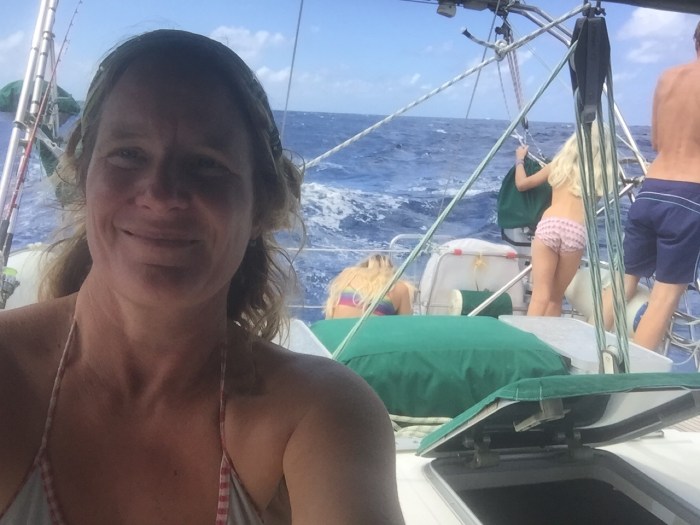 Bis zum siebten Grad Süd mussten wir noch heruntermotoren. Immer wieder kurz konnten wir den Wind eines Squalls erhaschen und freuten uns schon, nun den Passatwind erreicht zu haben! Doch das war nichts! Gestern Nacht war noch einmal so richtig streng mit Squalls und Segelwechsel, doch um drei Uhr setzen wir zum letzten Mal unseren Kurs Richtung Marquesas und seit dann sind wir mit der Genua und immer da 6 – 7 Knoten unterwegs, ohne Korrekturen. Wir sind glücklich und entspannt und so wie es momentan aussieht – könnte es noch die nächsten Tage so bleiben! Unterdessen segeln wir auch wieder im Blauen… Die paar Dauerregentage haben zwar dem Schiff und auch uns mal gutgetan. Eine erfrischende Abkühlung! Doch nun freuen wir uns wieder über blauen Himmel und weissen Wolken über dem glitzernden Meer. Die Crew ist zufrieden, immer mal etwas feines zu Essen, behält die Stimmung! Doch auch sonst, die Zeit geht schnell herum, mit all den kleinen Dingen die es zu tun gibt. Und natürlich mit der obligaten Schulzeit über offenem Himmel!