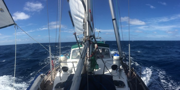 Das Segeln ist seit mehreren Tagen sehr entspannt. Längers waren wir nur mit der ausgebaumten Genua gesegelt und danach drehte der Wind mehr von Süden und wir konnten mit der normalen Besegelung, Gross und Genua auf dem Steuerbordbug segeln. Das war super weil die Schiffsbewegungen viel geringer sind, als bei dem Wind von hinten. Und zudem brauchten wir uns auch keine Sorgen zu machen wegen unserer Schiene, an der die Schlitten für unsere Bäume am Mast befestigt sind. Diese Schiene fing sich nämlich langsam an zu lösen… Doch wir hatten ein Spannset dabei, mit dem wir die Schiene so richtig fest am Mast anzurren konnten, damit sie sich nicht fester lösen kann. Wir müssen diese dann mal bei Gelegenheit verstärkt montieren. Ab und zu kam dann mal eine grosse Seitenwelle und wurde abrupt von unserem Schiffsbug abgebremst. Das gab dann einen Knall und das Wasser spritzte hoch bis zum Cockpit! Dann waren wir froh hatten wir noch unser Seitenverdeck unten, so waren wir von einer unliebsamen Salzwasserdusche geschützt! In der Nacht fliegen auch die fliegenden Fische aufs Deck, es war auch ein paar Mal einer ans Plastikverdeck gesprungen – mit einenem lauten «Klatsch» und mit einen Schreck wurde er so wieder ins Meer katapultiert. Der Schreck war auch unsererseits! (Einmal lag ich in mit offenem Fenster in unserer Koje und hielt ein Schläfchen. Da sprang einer am hellichten Tag auf unsere Badeplattformen und zappelte sich wieder ins Wasser. Wäre ja lustig gewesen, wenn dieser mir auf den Kopf ins Bett gefallen wäre!)