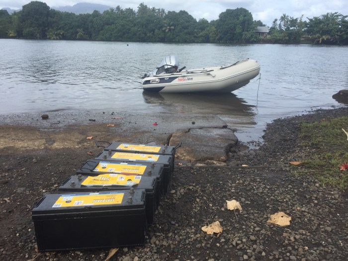 Wir hatten nur zwei Rucksäcke dabei und die waren schnell voll! Doch zuvor wanderten wir der Hauptstasse entlang und fragten bei zwei Tankstellen nach, ob sie Bootsbatterien für uns bestellen können. Unsere Batterien waren schon recht alt und wir waren immer auf Trab, dass sie nicht zu tief in der Ladung sinken und damit unbrauchbar werden würden. Oftmals liessen wir während den Überfahrten den kleinen Hondagenerator laufen, um dem entgegenzuwirken. Wir hatten in kurzer Zeit Erfolg und die Batterien würden am nächsten Tag bereits geliefert werden! So wussten wir was als Nächstes zu tun war: Die alten Batterien herausmontieren!