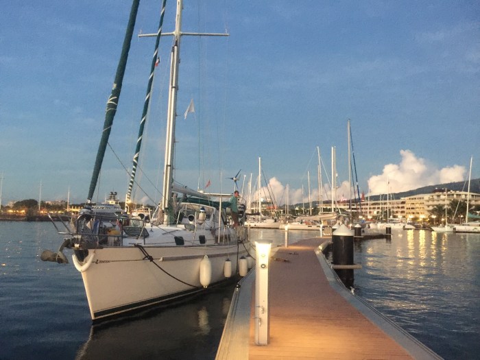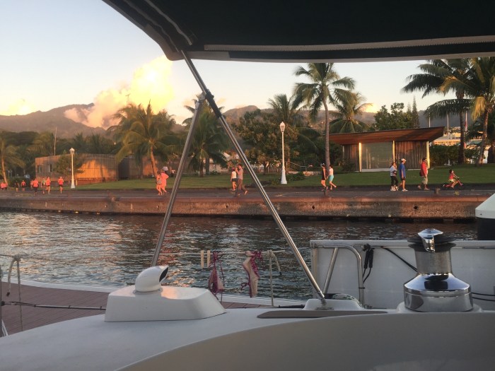 In Tahiti gibt es zwei Marinas. Die eine ist ein wenig ausserhalb der Hauptstadt und die andere ist in Papeete selbst. Wir wollten noch ein bisschen in den Genuss des komfortablen Marinalebens kommen und planten noch ein paar Tage in der Marina Papeete zu verbringen. Die Fahrt mit dem Boot dauerte sechs Stunden mit Gegenwind und hohen Wellen. Doch die Marinaanlage ist nigelnagelneu und schön. Auch der davor liegende Park hat uns gefallen. Die Kinder konnten vom Schiff und im Rasen spielen und an den vielen Sportgeräten turnen. Jeden Morgen und Abend joggten (auch ein typisches Zivilisationsmerkmal!) die Leute an unserem Steg vorbei, was uns animierte, uns auch zu bewegen! Also war am Morgen Training angesagt! Die drei Tage vergingen schnell. Ein bisschen in der Stadt flanieren, doch am Abend nach Ladenschluss um fünf Uhr war die Stadt, ausser an der Promendade, ausgestorben. Viel gab es nicht zu tun, doch wir genossen das entspannte Marinaleben mit all dem schätzbaren Luxus wie Duschen, eine Waschmaschine und Internet an Bord…