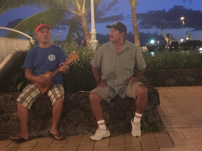 Papeete war dann auch, wie sie uns beide gesagt hatten, vorne an der Promenade recht hübsch und gepflegt, aber die Stadt schmutzig und nichts besonderes. Doch wir fanden den Platz, mit all den verschiedenen Food-Fahrzeugen, die alle auf einem Platz ihre diversen Spezialitäten anboten. Die Menüs wurden im Wagen gekocht und gegessen wurde vornedran auf Campingbestuhlung. Das hat uns gefallen. Die Stimmung war schön, ein Gemisch von vielen Lokalen Leuten und Touristen. Irgendwo auf einem Mäuerchen machten zwei ältere Männer zusammen Musik. Der eine sang ein traditionelles polynesischen Lied und der andere spielte dazu die Ukulele. Sie warteten darauf, dass ihre Frauen den Marktstand mit den Muscheln- und Perlenketten zusammengeräumt hatten…