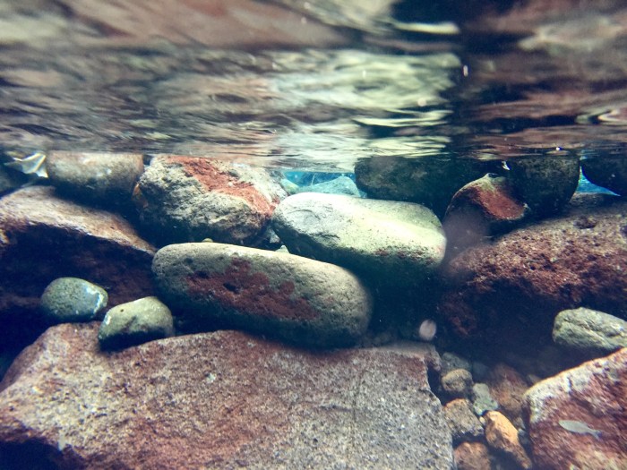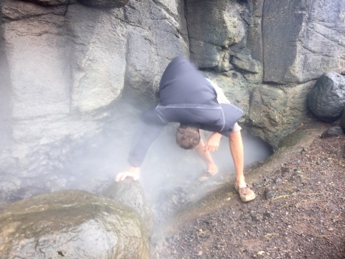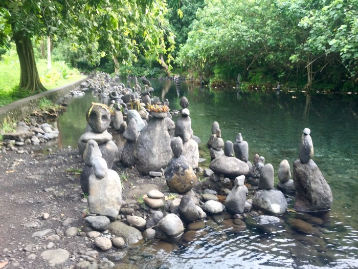 Ein anderes Highligt war das Schwimmen in der Quelle. Wir entdeckten schon beim ersten Vorbeifahren die vielen Steintürmchen am Flussufer und fanden dies sehr hübsch. Nun, auf unserer Entdeckungstour hatten wir Zeit, anzuhalten und es genauer in Augenschein zu nehmen. Und es war überwältigend! Es war ein Fluss, gesäumt mit zig Steintürmchen die mit Blumen geschmückt waren und glasklarem Wasser. Hinten sahen wir zwei einheimische Frauen baden und ein Mann war gerade beschäftigt, das Ufer von zu dichtem Bewuchs zu befreien. Es stellte sich heraus, dass dieser Mann all die Steintürmchen gemacht hat und er voller Liebe und Achtung für diesen Ort ist. Und er viel Zeit hier verbringt. Die beiden Frauen zeigten uns, wie man die Füsse in ein Loch zwischen zwei Steine stecken kann und so entspannt das Sprudeln der Quelle geniessen kann. Es gab Aale im Wasser welche die Einheimischen sogar streichelten. Wir tauchten mit den Taucherbrillen in das klare Wasser und waren einfach überwältigt von der Schönheit, die wir da sahen. Glitzernde Fische, Garnelen die auf den farbigen Steinen herumliefen und leuchtendgrüne Algen und dann der Aal. Wir genossen bis uns die Zähne vom kalten Quellwasser klapperten!