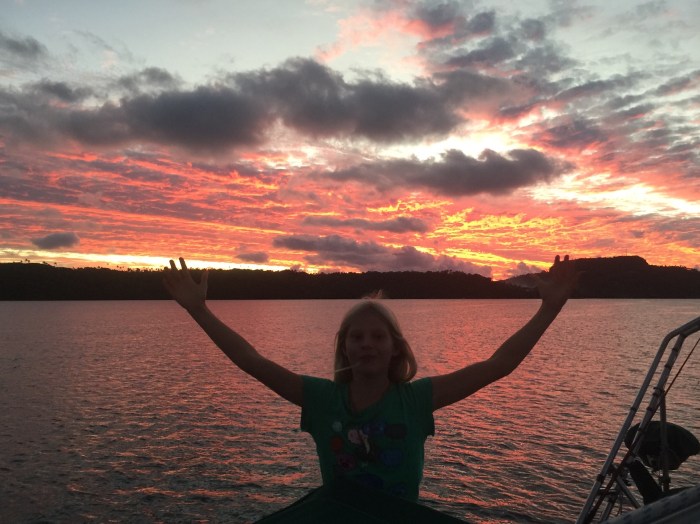 Wir hatten einen wunderbaren Abend zusammen und kamen erfüllt zum Boot zurück. Es war schon fast eine Art Freundschaft geschlossen worden, zwischen den Beiden und uns und so war es klar, dass wir am nächsten Tag David unser Werkzeug vorbeibringen würden, um seinen Motor flicken zu können. Insgesamt waren wir drei Nächte in dieser ruhigen Bucht und hatten noch ein paar Mal Kontakt mit Wicka und David. Einmal trafen wir sie noch an einem kleinen Büchtchen auf ihrer Insel, das wir entdeckt hatten und David machte sich auf den Weg, ein paar Trink-Kokosnüsse für uns herunterzuholen. Später gingen die Kinder noch ganz alleine mit ihrem klapprigen Böötchen, zur Nachbarsinsel mit, wo David seine Kirche hat, er ist nämlich noch Pastor! Sein Motor lief zum Glück und die Kinder kamen nach ein paar Stunden glücklich wieder zurück!