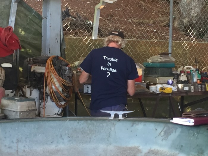 Wir fanden bald einen Hardwareshop, der ein Ventil in unser gesuchten Grösse hatte, super. Und es gab am Hafen einen Handwerker, der mit Motoren arbeitete. Es ist ein alter Segler, der sich hier noch ein kleines (aber wichtiges!) Business aufgebaut hatte. Sein Geschäft hiess «Trouble in Paradise»! Welch ein passender Name, der viele Segler schmunzeln lässt! Also, Ian von «Trouble in Paradise» hat unsere Impellerpume ein paar Stunden später wieder mit einer neuen Dichtung versetzt, mit einer Reservedichtung beiliegend. (Die Dichtung, die in den Galapagos eingebaut wurde, war für Süsswasser gedacht, kein Wunder dass sie rostete! Jedenfalls hatte sie wieder bis hierher gehalten!) 🙂
