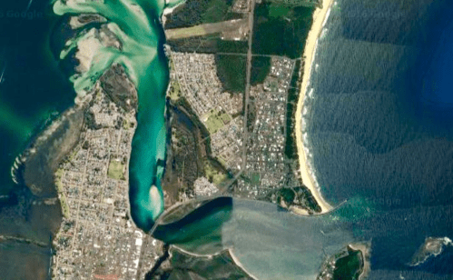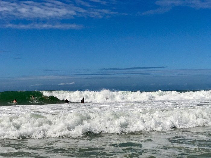 Eine Stunde mussten wir noch abwarten und segelten ein Stück weiter, bis das Tageslicht da war um die Einfahrt nach Camden Haven gut zu sehen. Im Dämmerlicht tasteten wir uns vorsichtig in die Nähe des Eingangs in den Fluss, über nur 5-6m tiefes Wasser. Es war um uns ein Getöse der brechenden Wellen. Wir waren noch ca. eine Viertel Seemeile davon entfernt, brach eine riesige türkisblaue Welle vor uns, deren Gischt nur so davon stob. Kurz davor schwammen drei Delfine ganz nahe vor unserem Bug vorbei, als ob sie uns den Weg versperren wollten… Da wussten wir, es ist zu gefährlich, wir kommen da nicht rein.