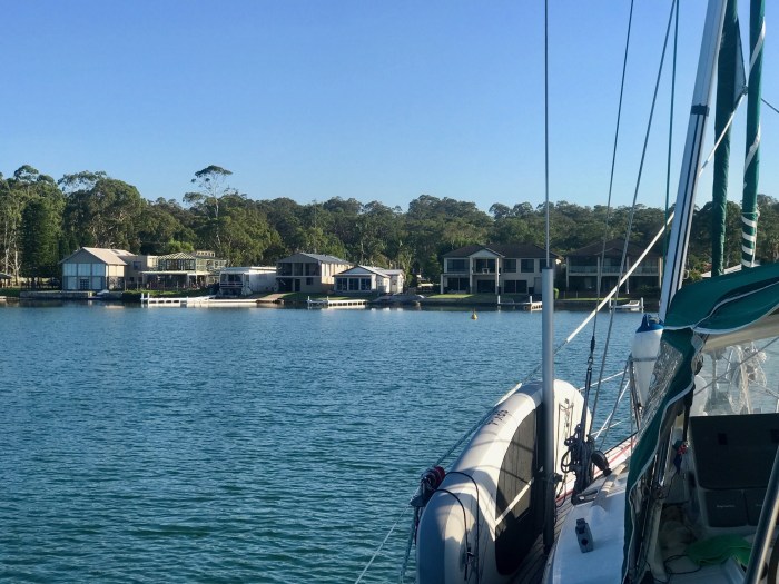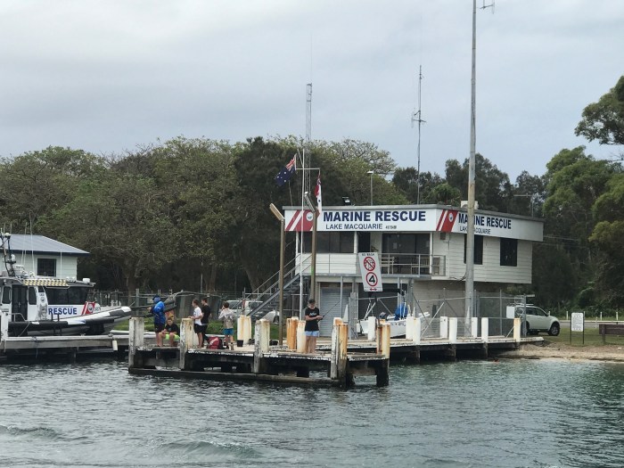Vor vier Uhr kamen wir am nächsten Tag, nach einer mehr oder weniger ereignislosen Fahrt vor der Einfahrt in den Lake Macquarie an und riefen zur Sicherheit die «Maritime Security» über Funk, um die Bedingungen zur Einfahrt über die Sandbar zu erfragen. Die Bedingungen seien gut und sie werde für uns auch eine Brückenöffnung um 16.00h reservieren. Alles klar! Später rief die Security Dame dann nochmals an, um uns zu fragen, ob wir eventuell ein Geleit von der Maritime Security in den See haben möchten, diese Passage könne allenfalls ein wenig knifflig sein. Da sagten wir nicht nein, wir wussten dass die Durchfahrt schwierig sein könnte obwohl eigentlich hatten wir keine Bedenken… Nach dem Passieren der Brücke wartete die Marine Rescue bereits auf uns. Wir mussten ihnen versprechen, dass wir ihnen auch wirklich folgen werden, und nicht die normale markierte Route nehmen… Na klar machen wir das. Nicht gerade langsam folgten wir unseren Führer durch tieferes und immer wieder extrem seichtes Wasser! Also ein zwei Mal wären wir trotzdem beinahe aufgelaufen. Es war wohl wirklich nur noch «eine Handbreit Wasser unter dem Kiel!». (Was aber im Sand aber auch nicht allzu wild gewesen wäre). Nun, wir waren froh, das durchs Wasser zirkeln hinter uns zu haben und wir uns von nun an auf dem ganzen See, der riesig ist und der grösste Salzsee in Australien, ohne Sorgen um die Tiefe, bewegen konnten. Unsere erste Nacht verbrachten wir in Wangi Wangi, einem netten kleinen Ort mit Post, Bar, kleinem Supermarkt und einigen weiteren kleinen Geschäften. Sympathisch.