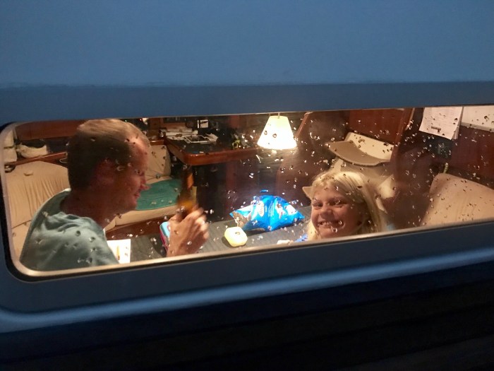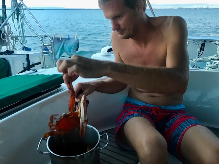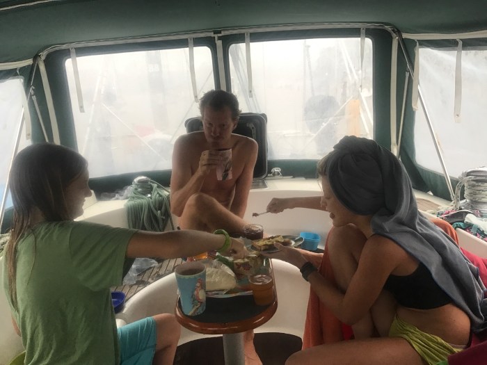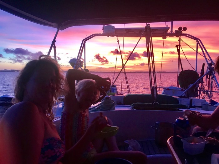 Am nächsten Morgen bekamen wir noch weitere zwei Katamaran-Yachten als Nachbarn. Beide davon kannten wir schon auf eine Art. «Taka O a» lag in der Blackwattle Bay neben uns, und beide werden wir an der Rally «Sail2Indonesia» teilnehmen. Das Boot «Surfari» kannte ich vom Internet! Ich bin nämlich nun seit einiger Zeit im Facebook mit Australischen Seglerinnen verknüpft, (Woman Who Sail Australia/WWSA) und da lassen sich manch gute Tips und Austausch vornehmen. Jocelyn Hunt von «Surfari» beklagte sich in diesem Forum, über ihre nicht ganz glimpflich verlaufene Ausfahrt von Camden Haven, am Tag nach unserem Versuch. Sie bekamen eine grosse Welle über den Katamaran, wobei ein Teil der Kunststoff Fenster aus ihren Plätzen sprangen, Wasser ins Innere und ins Cockpit kam und Handys und Computer im Salzwasser tränkte. Wir hatten Mitleid mit ihnen und zugleich waren wir froh, hatten wir die richtige Entscheidung getroffen, welches ja nicht selbstverständlich ist! Wir genossen dann später alle zusammen einen gemeinsamen «Sundowner» auf der ELAS.
