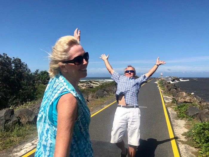 Um 8 Uhr morgens waren wir für die Weiterfahrt parat. Es war ein schöner Trip und am Nachmittag konnten wir schon die Bar in «Mooloolaba» passieren. Nervenkitzel hatten wir kurz beim Passieren der Moreton Bay. Die Tiefe reicht überall doch mit zunehmender Wellenhöhe begannen die Wellen zu brechen, was gar nicht gut ist! So bibberten wir ein paar Seemeilen und waren froh als wir dann wieder tieferes Wasser unter uns hatten! Der Sandbar vor dem Eingang des Flusses sahen wir gespannt entgegen. Immer wieder war es eindrücklich wie wir auf glattes Wasser zu treffen hoffen und links und rechts von der Hafeneinfahrt vergnügen sich die Surfer in den Wellen! Kaum waren wir über die heikle Stelle, hörten wir laute fröhliche Rufe von der Kaimauer herunter: Jocelyn und Ken hatten uns auf «Marine Traffic» gesehen und kamen uns Willkommen zu heissen!