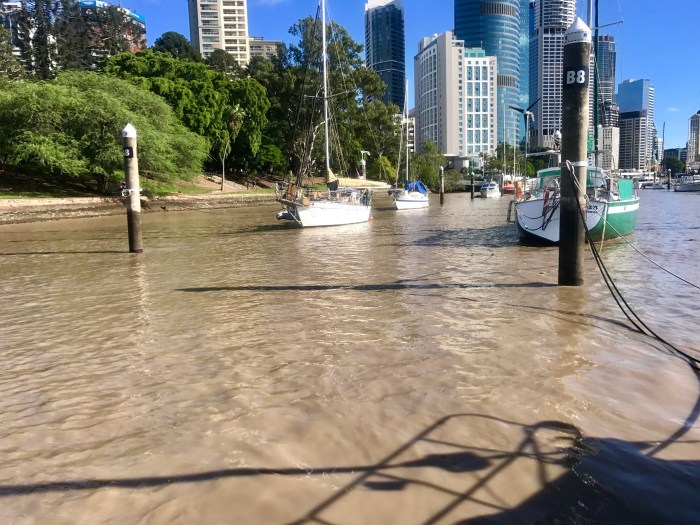 Nachdem wir das schlechte Wetter abgesessen hatten, alle Vorteile der Grossstadt genossen hatten und all unsere Freunde hier gesehen hatten, wollten wir uns wieder auf den Weg machen. Beim östlichen inneren Ufer der Moretonbay, bei der «Moreton Island» gab es den berühmten Ankerplatz vor einem Resort namens «Tangalooma». Das Besondere da waren die absichtlich versenkten Schiffswracks, die zum Tauchen und Schnorcheln toll waren. Wir sahen Bilder von klarem Wasser auf goldenem Sand und waren gespannt, ob wir die Situation so antreffen würden, nach den heftigen Regenfällen. Das Wasser des Brisbane Rivers war immer noch kaffeebraun mit vielem Schwemmgut. Wir wollten einen Augenschein nehmen und eine Nacht ankern.