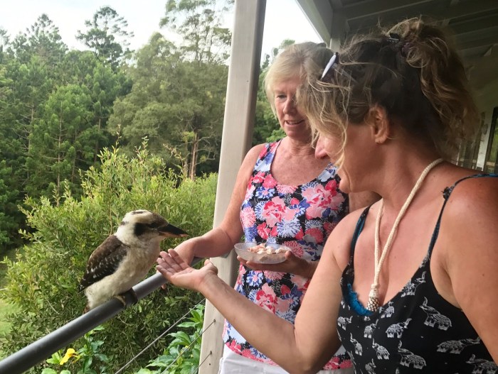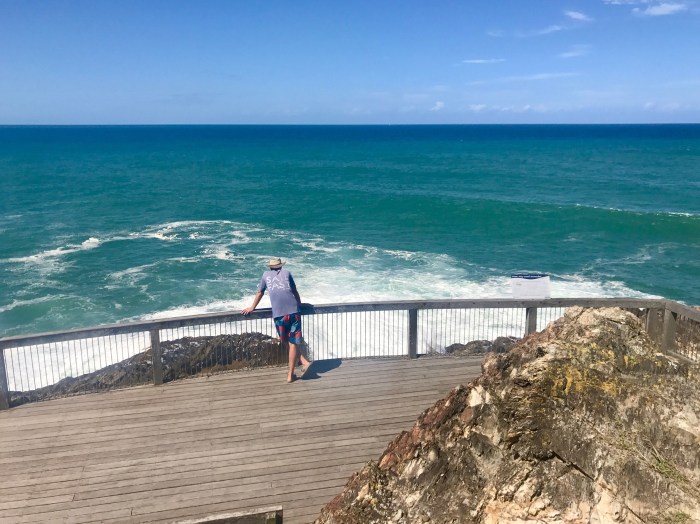 Am selben Tag begleiteten wir Deb zu ihren Einkäufen nach «Lismore». Wir mochten diese Stadt. Eigentlich war es fast ein wenig meine Lieblingsstadt! Es ist eine «Hippie» Stadt, überall sieht man Menschen barfuss und mit langen Haaren umherlaufen. Aber sie ist lebendig und wir haben nirgendwo so viele schöne Spezialläden, deren Auswahl mich überwältigte und erstaunte, angetroffen. Am nächsten Tag wollten wir noch «Ballina» anschauen. Ballina hat eine gefährliche Sandbar vor der Einfahrt, wir wurden davor gewarnt! Es war somit umso interessanter, die «Bar» vom sicheren Land aus zu begutachten. An diesem Tag war es recht windig und der Fluss führte immer noch braunes Wasser von den vielen Regenfällen. Es war wirklich ein spektakulärer Anblick – diese Einfahrt. Und wir waren froh, nicht mit unserem Boot hier zu sein. Die Wellen preschten gegen die Mauer und spritzten uns unerwartet mit ihrer Gischt nass. Es war ein Vergnügen, den Kräften zuzuschauen. Die Farben des Wassers vermischten sich mit dem tiefblau des Meeres mit dem braun des Flusses, und die weissen Möwen kreisten darüber. Gesättigt und erfüllt von dem Anblick, machten wir uns wieder auf den Heimweg, zu den «Maclean Ridges» wo Johnny und Deb Sernberg wohnten und verbrachten nochmal eine Nacht in ihrem wundervollen Heim.