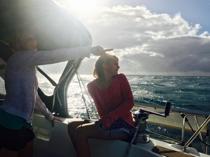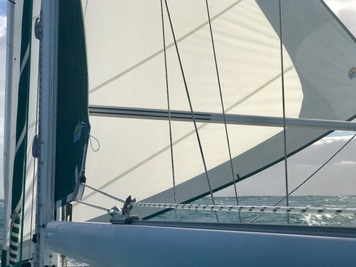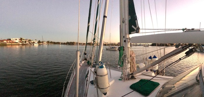 «Surfari», Ken und Jocelyn hatten den gleichen Plan: Ein paar Minuten vor uns, am frühen Morgen beim ersten Tageslicht, welches hier um ca viertel vor Sechs Uhr ist, hoben sie ihren Anker um in Richtung der Ausfahrt in Mooloolaba zu fahren. Kurz danach waren wir auch bei der Ausfahrt angelangt, welche glatt wie ein Kinderpopo und strahlend blau im Morgenlicht vor uns lag. Es ist ein schönes Gefühl, in den blauen Morgen hinein – aufs Meer hinaus zu fahren… Wir hatten ca 50sm vor uns und die Sonne schien. Es war Leichtwind angesagt. Kurz wägten wir zuvor noch ab, ob wir noch einen Tag lang warten wollten, da war mehr Wind angesagt. Doch mehr Wind bedeutet auch mehr Wellen – und diese wollten wir mit unserem Plan über die Sandbar zu fahren, nicht. Also fuhren wir los und zogen in Erwägung, in diesem Falle wieder mal unser Leichtwind Segel aufzuziehen. Das Meer war wirklich erstaunlich glatt, perfekt für unseren weissen Genaker mit dem «Elas» Schriftzug darauf. Wir hatten diesen seit den Galgapagos nie mehr gebraucht, es hatte für dieses Segel immer zu hohe Wellen und das dadurch erzeugte Schlagen wollten wir dem Segel nicht antun. Doch heute war es perfekt. Jedesmal freuen wir uns auch über den Anblick, wenn wir dieses schöne Segel oben haben! Ein paar Stunden waren wir dann so unterwegs. Doch der Wind nahm immer mehr zu und somit auch die Wellen. Also wieder runter mit dem Segel und die Genua ausbaumen. Eine Zeit lang nahmen wir auch das Gross noch zu Hilfe und waren mit «Papillon» unterwegs. Wir kamen gut voran und der Turn grenzte an einen perfekten Schönwetter Turn! Wie waren wir privilegiert! Immer ein Stück weiter segeln zu können…