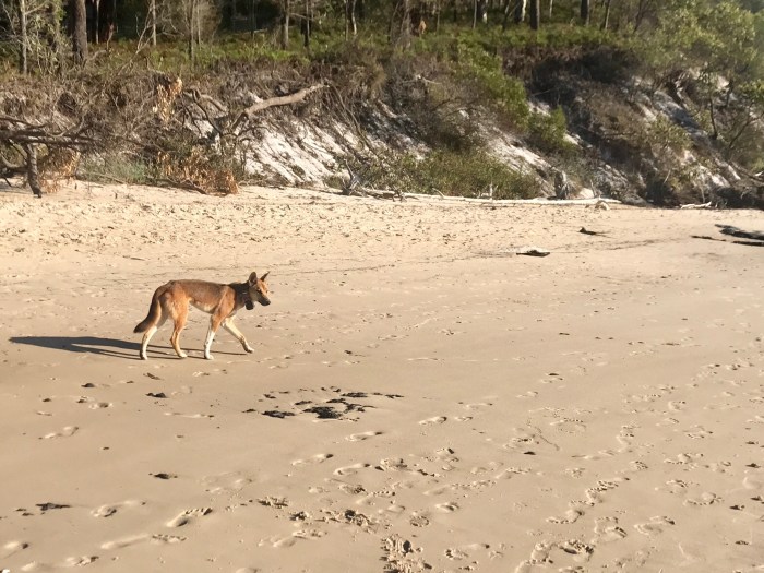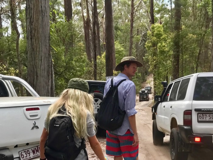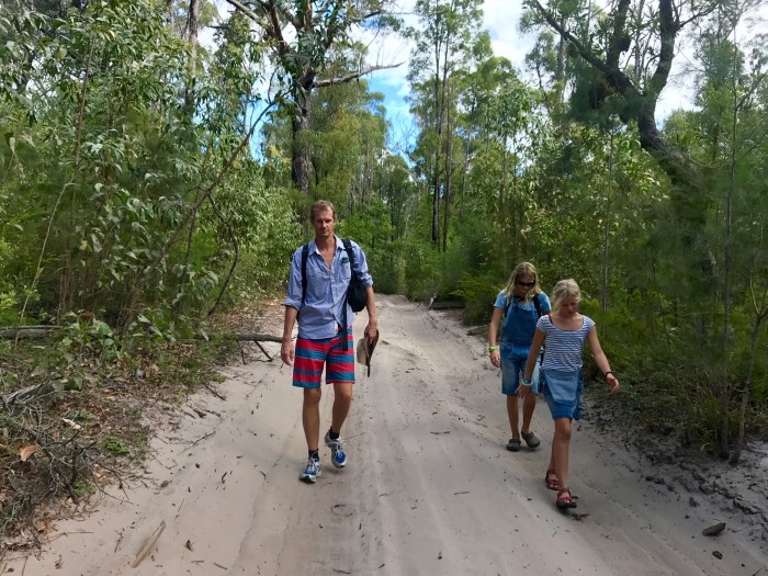 Der Wanderweg auf einem schmalen Sandpfad – die Fraser Island ist die grösste Sandinsel der Welt – war gut ausgeschildert. Es liess sich gut auf dem Sand laufen. Zuerst leicht abwärts zu einem kleinen Flüsschen und dann wieder aufwärts. Nach guten zwei Stunden durch den trockenen Eukalyptus Wald laufen, waren wir schon beim See. Der leuchtete dunkelblau und türkis durch die grünen Bäume! Ein Wahnsinns Anblick und noch schöner war die Vorstellung, schon bald in das kühle, frische Süsswasser zu tauchen! Der Sandstrand war so weiss, dass man es ohne Sonnenbrille kaum aushielt. Es war ein Genuss, dem See entlang zu wandern, zu staunen was die Natur so wundersames entstehen liess. Der See ist reines Regenwasser, das jahrmillionen alte Sediment war zuzusagen wasserdicht. Der See ist nur 5m tief aber unheimlich sauber und klar und leicht sauer, das erklärt wohl auch, warum es fast keine Pflanzen hat, die im See wachsen. Wir hatten auch das Glück, dass Kim eines der kleinen Schildkrötchen entdecken konnte, die in dem See leben, ein weiteres Highlight. Am Nachmittag machten wir uns wieder auf den Rückweg. Diesmal hatten wir weniger Glück mit der Beschreibung des Weges. Nirgends konnten wir unseren Rückweg, die Route 2 beschildert entdecken. Wohl waren wir schon ein wenig zu Weit gelaufen.. Einer der Ranger erklärte uns dann, wir müssten ein Stück auf der Off-road-Strasse laufen, später käme dann die Abzweigung. Fast hatten wir das Gefühl, er freue sich, dass es da noch Leute gibt, die zu Fuss gehen! Nachdem wir ein kurzes Stück auf dem mit zwei tiefen Radrinnen versehenen ca drei Meter breiten Sandweg gelaufen waren, wussten wir warum: Ein grosses Off-road Fahrzeug nach dem Anderen rauschte an uns vorbei und wir mussten schleunigst an den Wegrand hinaufklettern, um uns in Sicherheit zu bringen! Ich persönlich vermisste den entspannenden Wanderpfad – Kim hingegen fand die Off-road-Autoshow ganz interessant. Für Neele war dieser Weg voller Erwartungen, da sie erhoffte dass wir von einem der Wagen mitgenommen werden würden – und sie vom Wandern verschont bliebe! Dem war aber nicht so, nur wurden wir einige Male erstaunt gefragt, ob alles in Ordnung sei! Die versprochene Abzweigung kam dann erst sehr viel später, die «gefährliche» Strecke sind wir sozusagen gerannt. Doppelter Sport Einsatz! Das letzte Stück konnten wir dann noch entspannter zurücklegen, bis zum Strand und danach dem Strand entlang bis wieder zum Resort. Perfekt war auch unserer Rückkehrzeit, es reichte nämlich gerade noch für ein weiteres Bad im Pool und ein Bier beim Sonnenuntergang!