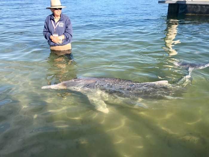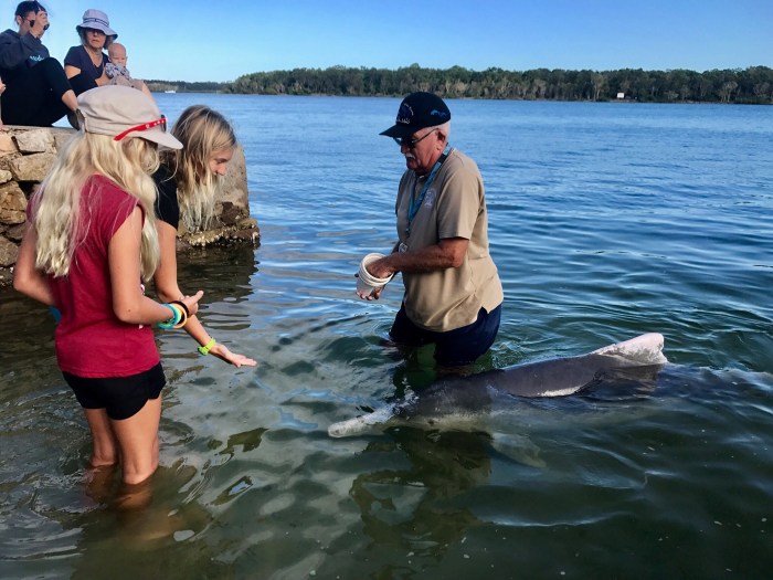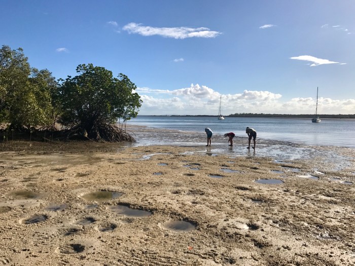 Wir wollten noch ein Stück im Fluss südwärts fahren, zur «Tin Can Bay», bevor wir dann weiter nördlich gehen wollten. Tin Can Bay ist ein kleiner, ruhiger Ort wo viele mit Booten Ferien machen. Es gibt unendlich viele Möglichkeiten das Wasser und die Natur zu geniessen. Die Landschaft ist geprägt von Mangroven und den riesigen Sandbänke die bei Hochwasser verschwinden und bei Niedrigwasser wieder zum Vorschein kamen. Viele Motorboote und Hausboote fallen einfach trocken, bis das Wasser wieder kommt. Wir machen einen grossen Spaziergang durchs Dorf und über die Sandbänke. Hier an diesem Ort kann man jeden Tag am Morgen um 8 wilde Flussdelfine füttern. Wir sind zur Schulferienzeit da, und so hat es am nächsten Tag super viele Leute vor dem kleinen Kaffee am Strand. Doch die Delfine waren auch schon da und warteten brav neben den «Rangern» bis es dann Fisch gab. Die Flussdelfine heissen «Humpack-Delfine» und haben eine lange dünne Schnauze und fast keine Rückenfinne. Ein Tier mit einem Jungen war speziell toll zu beobachten. Lenja und Neele durften dann beide einem Delfin einen Fisch füttern. Es war ein spezielles Erlebnis, obwohl wir schon oft wilde Delfine beim Segeln unterwegs angetroffen hatten. Wir verbrachten sicher zwei Stunden damit, zu beobachten, zuzuhören was die Ranger über die Tiere erzählten und den lustigen Geräuschen zu horchen, die vor allem ein Tier machte!