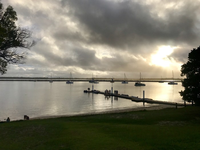 Seit einigen Wochen nun spielt das Wetter in der Region verrückt. Es ist extrem wechselhaft. Regen, Sonne, grauer Himmel oder gigantische Wolkengebilde. Alles in allem ist es eher kühl, wir brauchen in der Nacht wieder Decken, wobei es aber auch schnell extrem heiss werden kann, wenn der Himmel frei ist. Auch der Wind ist wechselhaft, ausser seit den letzten zwei Wochen. Da blies dieser nämlich tagelang zuerst aus Südwest und dann aus Südost. Wenn wir auf diesen Wind aufgestiegen wären, wären wir nun mindestens in Brisbane! Aber an unserem Reisetag war noch Schwachwind und unser Ziel war Port Stephens. Port Stephens ist eine breite Naturbucht in der Delfine heimisch sind und während der Saison auch von Walen aufgesucht wird. Im Gegensatz zu Newcastle gibt es keinen Industriehafen und das Wasser war das klarste seit langem. Die Einfahrt in die breite aber an vielen Stellen seichte Bucht ist recht schmal. Links und rechts sind viele Sandbänke. Wir machten uns in der Nelson Bay an einer Mooringboje fest. Unterdessen war nämlich ein grosser Regenguss auf uns hernieder gegangen – gerade als wir auf dem Weg durch die schmale Passage waren. Die Bojen lagen ganz nahe am Sandstrand, was uns sehr gefiel.