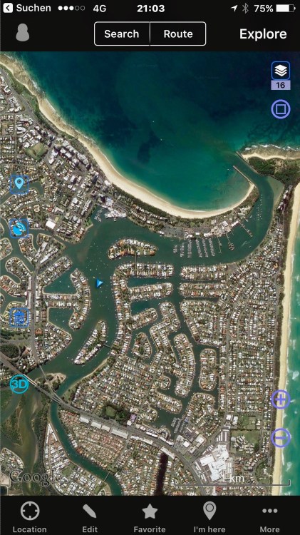 «Mooloolaba» ist ein netter Touristenort mit einem tollen Surfbeach. Noch am Ankunftstag machten wir uns ein kurzes Bild davon. Unser Ankerplatz war im Hauptteil des Flussarmes, der gegen alle Seiten ausgebaggert und zu Kanälen gemacht wurde, wo nun stolz zig Moderne Häuser in Reih und Glied, jedes mit Steg vornedran prangten. Einer ähnlichen Bauweise waren wir schon an der Gold Coast begegnet. Wieder ein wunderbar, stiller und sicherer Ankerplatz, wir genossen es. Die weiteren Tage verbrachten wir in dem netten Ort vor allem am Strand. Die Wellen da waren fantastisch anzusehen und es war ein Vergnügen sich mit ihnen zu messen. Nach drei Tagen in Mooloolaba, wo sich nett die Zeit verbringen lässt, waren wir aber schon wieder abfahrbereit: Die Wide Bay Bar war unser Ziel.