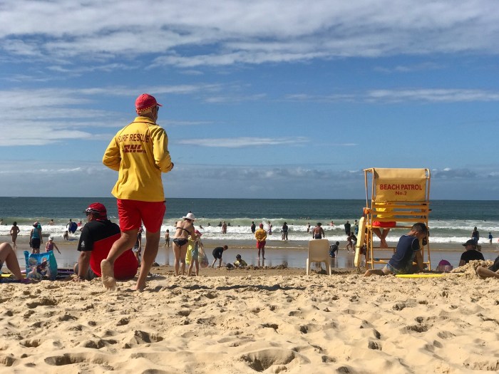 Mooloolaba Beach – mit der typisch rot gelben Beach Patrol, die oft von Freiwilligen gemacht wird. Die Strömumgen die sich durch den Abfluss der Wellen und Gezeiten gibt, sind stark an Australiens Küsten.