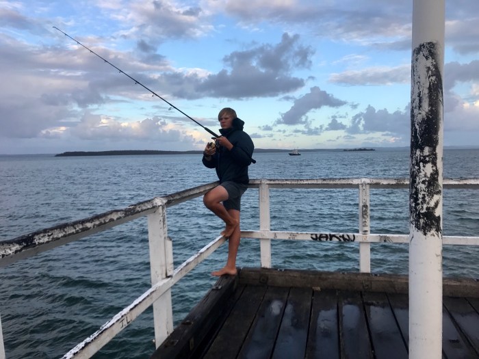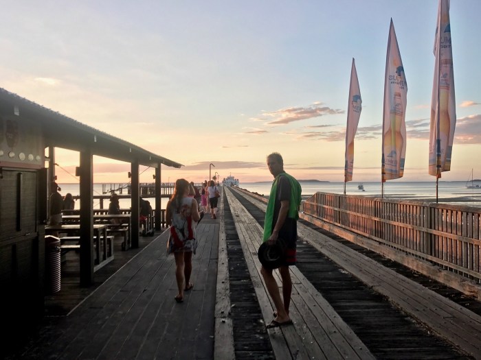 Ich fühlte immer noch ein Druck im Magen. Zudem fühlte ich mich am ganzen Körper schlapp, meine Lunge fühlte sich unterdessen auch komisch an… so blieb ich an Bord während Kim und die Kinder die Surfboards nahmen und zum Strand paddelten. Eine Stunde später kamen sie zufrieden zurück, es hatte ihnen gefallen. Sie hatten eine kleine Lagune entdeckt wo man gut darin baden konnnte! Erstaunlich war aber wieder die starke Strömung die sich durch den Gezeitenwechsel aufbaute, das heisst das Boot wechselte in der Nacht die Richtung in der es steht. Am Morgen danach brachen wir auf nach Urangan. Urangan liegt neben «Torquai» in der «Hervey Bay» ist das Hauptzentrum des Fraser Island Tourismus. Von da aus starten alle Boote und die Fähre zu der Insel. Urangan ist zusammengewachsen mit zwei weitern Ortschaften und man kann, wenn man ein Auto zur Verfügung hat, sich alles besorgen, alle Arten Supermärkte und andere grosse Ladenketten sind ansässig. Was ein besonderes Markenzeichen von Urangan ist, ist der 880m lange Pier. Auf diesem, damals mehr als einem Kilometer langen Pier, waren zur Jahrhundertwende Züge gefahren mit einer Ladung von Kohle, Zuckerrohr und mehr um dies auf die Schiffe zu verladen. Ein sehr imposantes Bauwerk, das nötig war weil das Meer in der Hervey Bay sehr seicht bis weit hinaus ist!