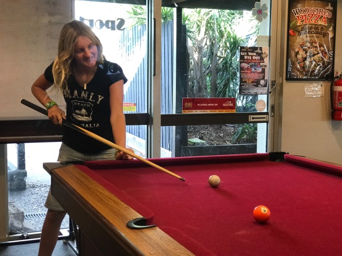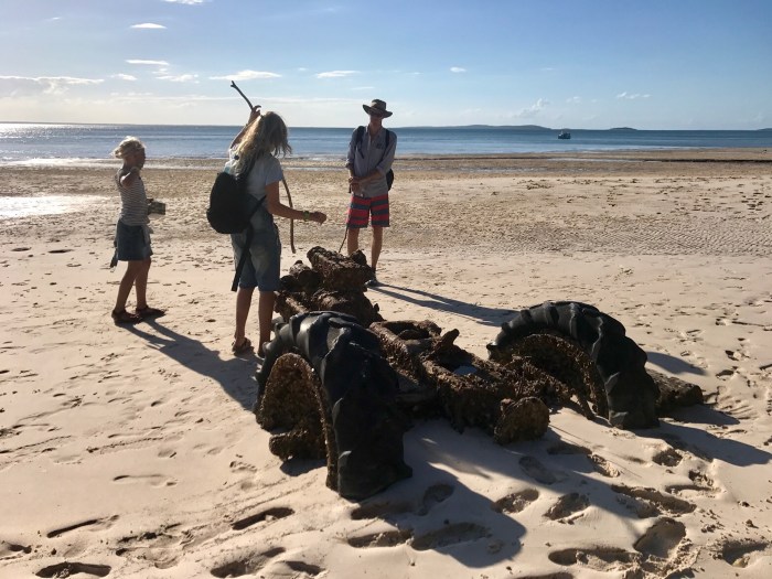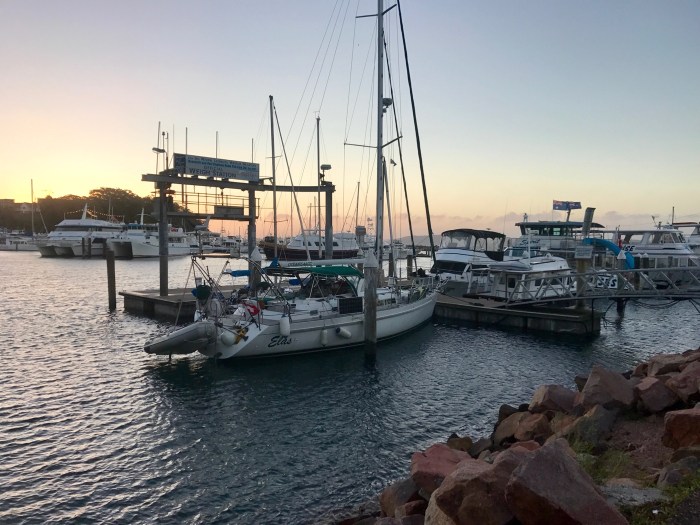 Während ein paar Stunden Segelns waren wir vor der Marina Urangan. Wir hatten viel Wäsche zu waschen und wollten auch wieder mal frisches Wasser tanken, so entschieden wir uns eine Nacht in die Marina zu gehen. Die Marinakosten waren dann auch recht OK, wir mussten 55 AUD für eine Nacht bezahlen. Was uns dann an der Marina gefiel war, dass die Marina nicht wie viele andere australische Marinas im Nirgendwo war, sondern direkt vor einem Ort. Wir schätzten das Angebot der Marina, das Marinafahrzeug für 15 AUD für zwei Stunden mieten zu können. Eine geplante Unternehmung hier in Urangan war nämlich uns für einen neuen Dinghi Motor umzuschauen! Unser war ja mal in der Karibik im Salzwasser gelegen und machte immer wie lautere Töne, bis er dann endlich anfing zu drehen! Da wir nur zwei Stunden Zeit hatten teilten wir uns auf: Kim und Lenja suchten Motorenwerkstätten auf und Neele und ich plünderten den Aldi, wobei Neele immer wieder sagte: «Mami du bist verrückt!» als ich einen ganzen Karton mit Basilikum Pesto in den Wagen stellte. Aber dieser Einkauf war nun nicht mehr nur für Australien gedacht, sondern meine Einkaufsplanung ging weiter, bis für nach Indonesien und weiter. Kim und Lenja waren nicht besonders erfolgreich gewesen mit ihrer Recherche betreffend Motor. Sogar alte zehnjährige Motoren waren immer noch sehr teuer, so lohnt es sich doch unseren guten Honda 2.3 PS zu reparieren…