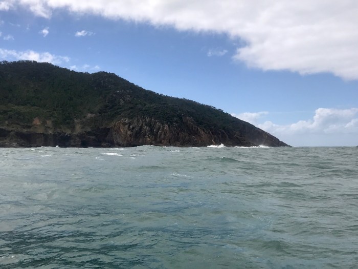 Wir waren um 14.00h aus der Bucht raus. Leicht nördlich von Port Stephens gibt es die Broughton Island, ein Naturschutzreservat mit Ankerplätzen auf der Süd- und Nordseite, je nach Windbedingungen. Es hätte uns gereizt, die Nacht am Anker vor der Insel zu verbringen, aber wir konnten uns auch vorstellen dass das Meer da draussen immer noch zu aufgewühlt war und die Wellen auch in die geschützten Buchten hereinströmen. Es war ein Versuch wert. Kurz legten wir dann auch an die vorhandene Mooringboje an und beobachteten das Geschehen um uns herum. Lustigerweise war die Boje direkt neben einem Riff gesetzt, das nun wild von Wellen überschäumt wurde. Kein guter Anblick. Das Wetter kam auch dunkel und windig daher, auch keine gute Vorstellung, so zu übernachten. Also lösten wir uns wieder und nahmen Kurs auf Camden Haven. Für unser erster Plan nach Fosters zu segeln, was der nächste mögliche Stopp gewesen wäre, waren wir nun zu spät unterwegs, wir kämen nur ein paar Stunden später, mitten in der Nacht an. Also einen Über-Nacht Segeltörn! Das hatten wir schon lange nicht mehr!