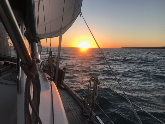 Mit Lust segelten wir weiter – der Nacht und Camden Haven entgegen. Eine grosse Schar brauner Wasservögel breiteten sich vor unseren Augen aus und sie flogen tief und kunstvoll über die Wellen. Der Regenbogen und die jagenden Delfine machten das Bild dann perfekt! Einfach überwältigend, was wir da zu sehen bekamen! Der Wind war gut, fast zu gut. Wir mussten acht geben, dass wir nicht zu schnell unterwegs waren. Ich genoss meine erste Nachtwache seit langem, obwohl ich dauern am umher rennen war und keine Ruhe fand, etwas zu tun. Als mich Kim dann ablöste, wusste ich dass wir bei meiner nächsten Wache vor Ort sein würden.