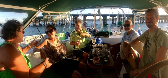Jocelyn (Surfari), Debi und Jono von Taka Oa und Ken (Surfari) bei uns beim Sundowner