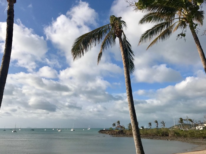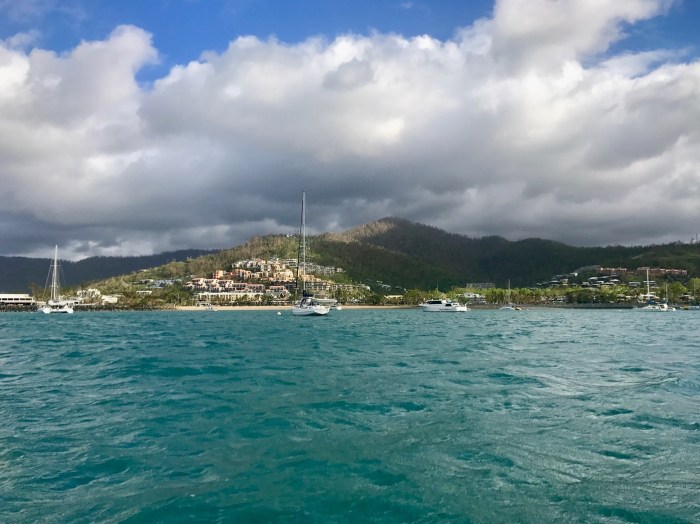 Am nächsten Tag gings dann die paar Seemeilen nach Airlie Beach. Starkwindböen schossen zwischen den Inseln hindurch und wir brausten mit neun Knoten in Richtung unseres Ankerplatzes. Vor Airlie Beach liegt ein grosses, flach auslaufendes Ankerfeld mit vielen Booten an Mooringbojen und geankerten Schiffen. Wie sich in den nächsten Tagen herausstellte waren wir da gut geschützt vor Starkwind und auch der Schwell war erstaunlicherweise in Ordnung.