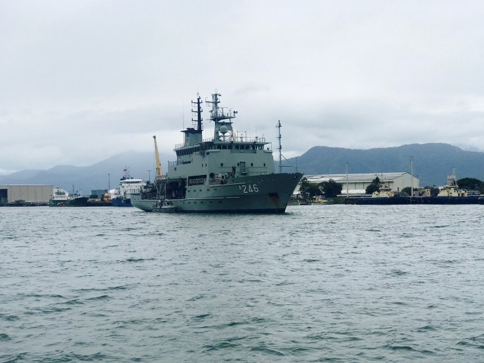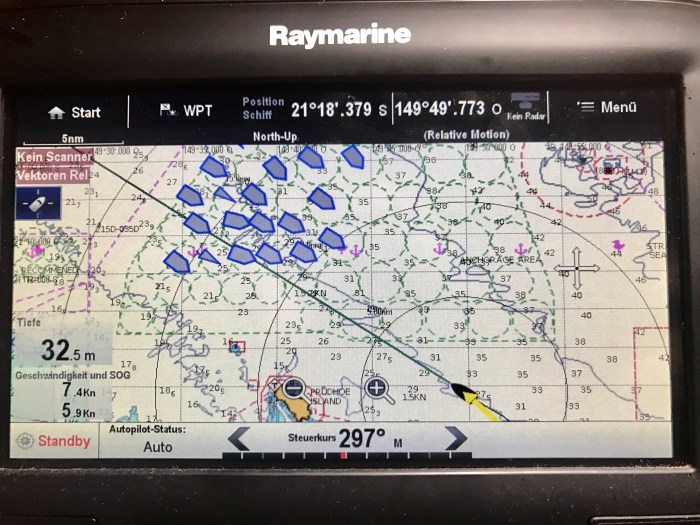 Gegen Mittag hoben wir auf Percy unseren Anker. Am frühen Morgen sollten wir dann vor Shaw Island sein. Die Bedingungen waren gut, die Segel gut gefüllt und wir kamen gut voran. Auf unserem Plotter erkannten wir im Verlauf unserer Reise vor Mackay grosse grüne Kreise, die ein Ankerfeld für Frachter kennzeichnete. Wir machten uns noch keinen Kopf in der Annahme, dass dies wohl so oder so frei sein würde. Mit der Zeit tauchten dann aber auf unserem Bildschirm ein Frachter nach dem Anderen mit dem AIS-Symbol auf! Zuletzt befand sich dann in jedem der grünen Kreise ein solcher Gigant – und wir mit Kurs direkt zwischendurch! Normalerweise wäre ich schon längst in unserer Koje am vorschlafen, doch diesen Moment, wie wir da zwischen den Giganten hindurch segeln, wollte ich mir nicht entgehen lassen! Aufregend war es allemal, doch glücklicherweise standen die Giganten alle in der selben Richtung, genug weit auseinander und es gab keine Bewegung der Schiffe – alle lagen sie um neun Uhr Abend still vor Anker um am nächsten Tag mit Kohle beladen zu werden. Wir versuchten uns an den Lichtern der Frachtschiffe zu orientieren, welches dasjenige ist in der Wirklichkeit im Vergleich zum Plotter, welches wir gerade passieren. Die Lichter zeichnen sich immer mehr ab und wir konnten dann schliesslich das ganze Fahrzeug erkennen. Wir passieren die Riesen respektvoll mit einer sicheren Distanz von einer halben Seemeile. Alles war ok und absehbar und so konnte ich mich danach beruhigt in die Koje verziehen.