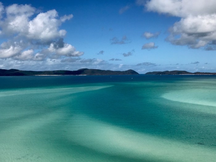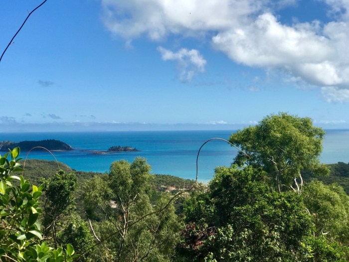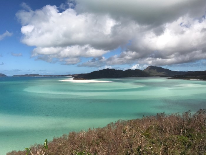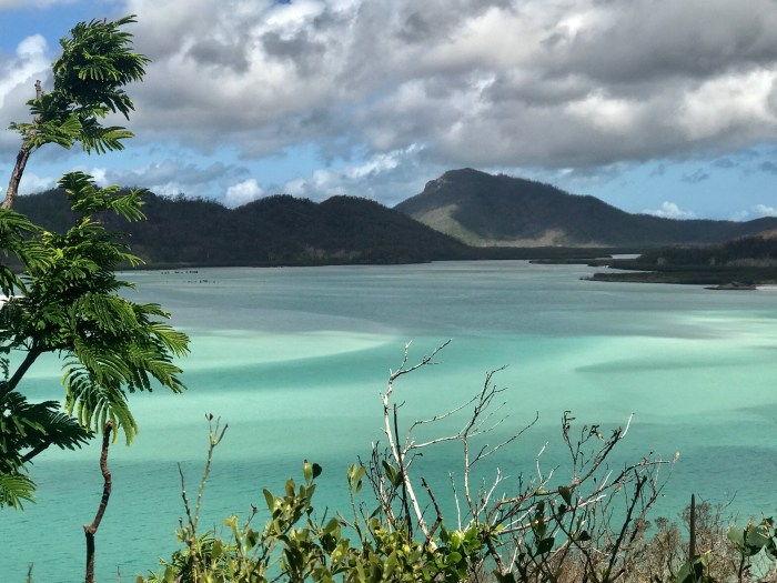 Ganz anders war dann unser zweiter Ankerplatz an der Ostküste der «Whitsunday» Insel, nahe dem berühmten Whiteheaven Beach. Vom Ankerplatz aus gab es einen Pfad über den Hügel auf die andere Seite von wo man vom Aussichtspunkt her über das eindrückliche «Hill Inlet» schauen konnte. Das war wohl etwas vom Schönsten was wir je gesehen hatten! Der blendend weisse Quarzsand (zu 99% Quarz) der zu Urzeiten aus dem Magma ausgewaschen wurde, liess die Farben des Meeres über eine grosse Distanz leuchten. Wir kletterten dann runter zum Strand und liessen die Weite, die Klarheit, Helligkeit und die Farben des Wassers auf uns wirken. Seelenbalsam pur! Die Anwesenheit der üblen Sandflies, (oder Midgies wie sie hier heissen) die hartnäckig juckende Stiche hinterlassen und die es in den Tropen überall gibt, hielten uns von zuviel Verklärung über diesen wundervollen Ort ab!