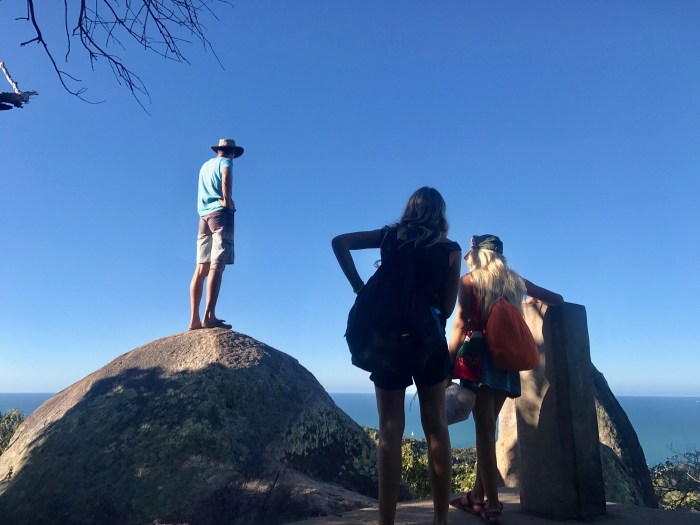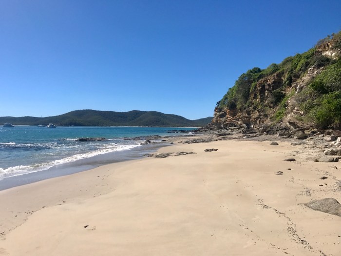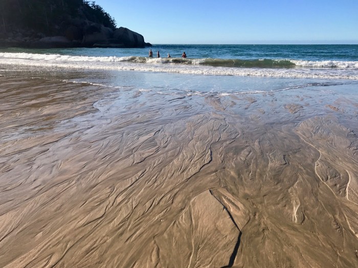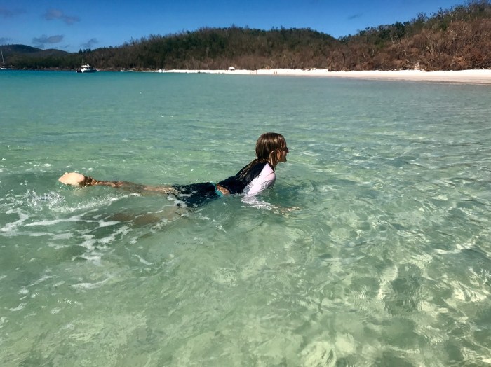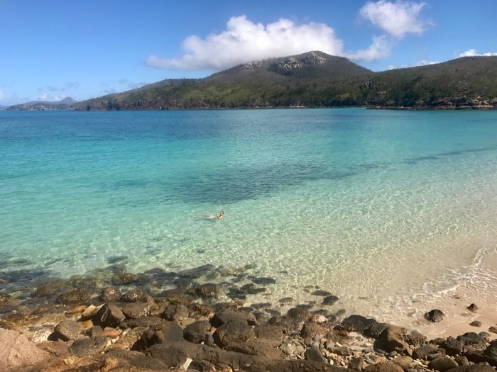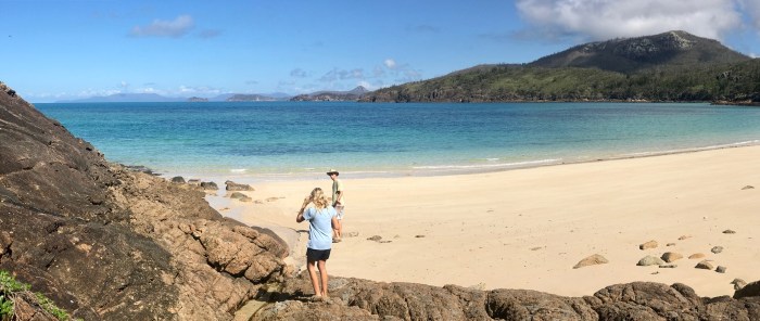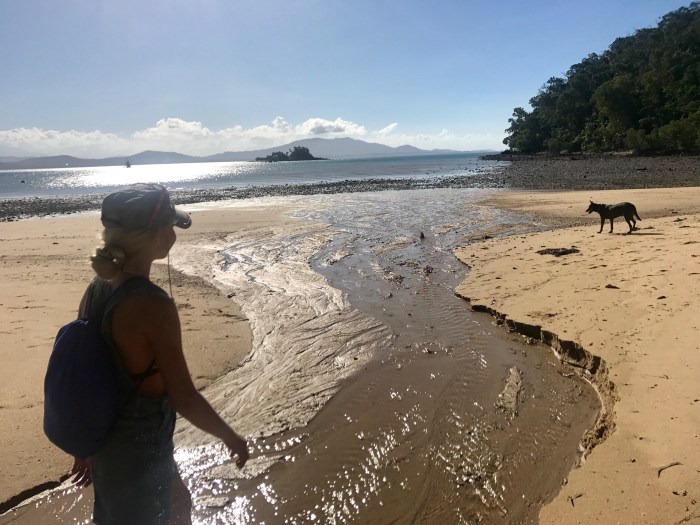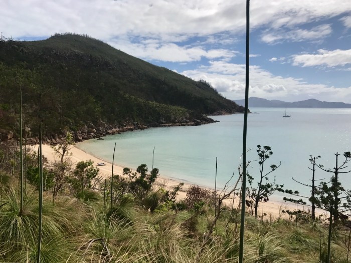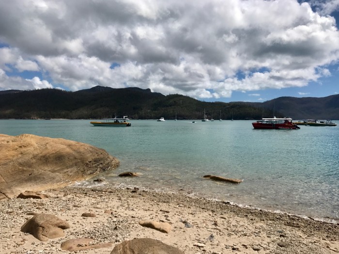 Der berühmte «Whizehaven Beach» war von dieser Bucht nur einen Katzensprung entfernt. Erstaunlicherweise lagen wir in der relativ offenen Bucht sehr ruhig mit doch einigen anderen Booten: Grosse farbige Ausflugskatamarane, Fährschiffe, Charteryachten und ein paar wenige Cruiser wie wir. Vom Ankerplatz aus sah der Strand nicht besonders aus, aber wenn man näher kommt, entpuppte sich der Strand wieder als «himmlisch»! Das Wasser erschien auf dem weissen Sand unheimlich hell, blau und transparent, der Strand zog sich über Kilometer hin bis wieder zum «Hill Inlet», wo wir am Tag zuvor waren. Die Vegetation dem Strand entlang war braun und tot. Denn von ein paar Monaten zog der Zyklon «Debbie» über den Touristenort hinweg und zerstörte die Wälder inklusive deren Wege hindurch. Wir wanderten den neu erstellten Wanderweg über den Hügel zum Strand der gegenüberliegenden Seite, wo es einen abgelegeneren, einsameren Strand gab. Es war eine schöne Wanderung durch den Busch, doch die Zerstörung war bis tief hinein. Der Zyklon traf an dieser Stelle vom Meer auf Land mit seiner grössten Kraft. Die kurze Wanderung von ca 8km hatte sich gelohnt. Wir trafen auf eine kleinere, mit roten Felsen umrandete Bucht mit dem selben weissen Sand wo wir ganz alleine waren. Es hatte sogar ein winzig kleiner Wasserfall wo wir uns nach dem (Nackt-)baden wieder vom Salz befreien konnten.