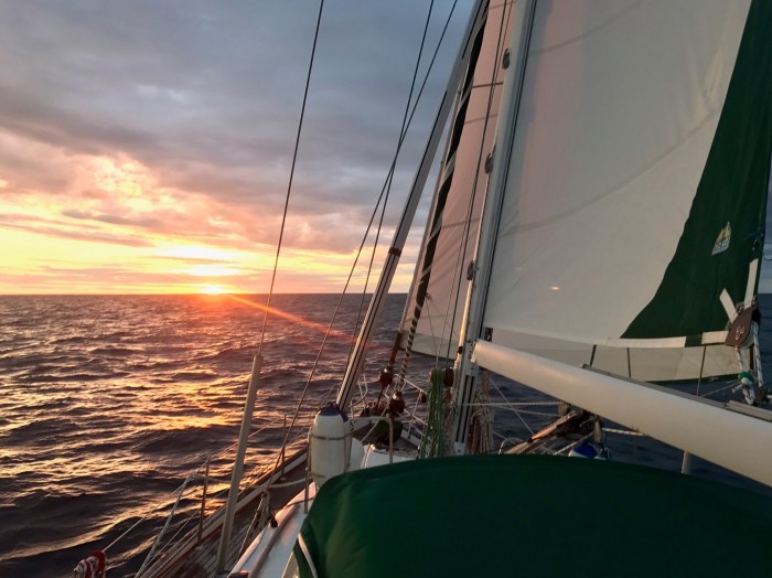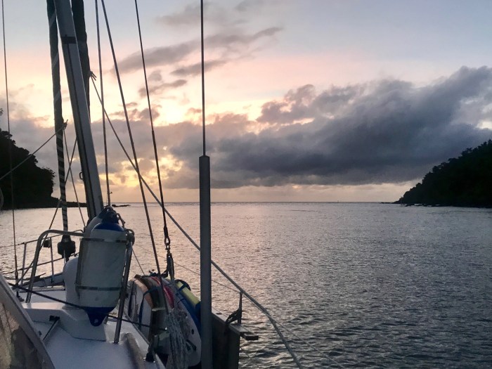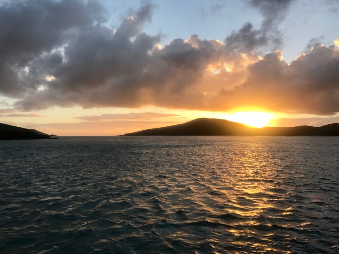 Der Kurs in Richtung «Great Keppel Island» war einmal nicht «Downwind» sondern wir konnten mit Gross und Sturmsegel Querab segeln. Das ist der angenehmste und schnellste Segelkurs und wir genossen die ersten paar Segelstunden in den Abend hinein. Der Wind frischte dann aber wie vorhergesagt auf, von 20 bis auf 35 Knoten und meine erste Schlafpause von ca 21. Uhr bis 24.Uhr war mühsam. Die Wellen schlugen an den Rumpf weil wir ein bisschen zu wenig Segel draussen hatten, weil wir ja auch nicht zu schnell sein wollten. Kim war am riegeln und ich war unruhig. In der Kabine bekommt man viel vom Wetter mit und eben auch doch wieder nicht. Wenn man draussen ist und sehen kann ist meistens alles halb so wild! Doch wie gesagt, erholsam war meine erste Schlafpause nicht! Dann war Kim an der Reihe. Auch er hatte Mühe sich zu entspannen. Wir hatten nur wenig Segel draussen und segelten aber immer zwischen 5 und 7 Knoten. Als wir uns dann wieder ablösten, machte ich nur eine kurze Schlafpause von ca 2h. Nach dieser Zeit genoss ich dann meine Wache richtig. Ich war fit und schaute mir neben den Kontrollen einen Film auf dem IPad an. Bei einer der Kontrollen entdeckte ich ein gelbliches Licht, wie das eines Ankerlichtes an der Mastspitze, sehr nahe neben uns und tief am Horizont. Auf dem AIS konnte ich kein anderes Boot sehen.. Ein wenig Müde war ich aber wohl doch, da ich der absoluten Überzeugung war, da ist ein Boot neben uns auf dem selben Kurs doch bei der stockdunklen Nacht war nichts zu erkennen. Immer wieder schaute ich aus der Lucke, ob der vermeintliche Segler den Abstand währt…. In der Dämmerung musste ich dann zu meiner eigenen Belustigung feststellen, dass das «Ankerlicht» der Jupiter Stern war, der in dieser Nacht unheimlich nah und hell leuchtete – zum Anfassen nah!