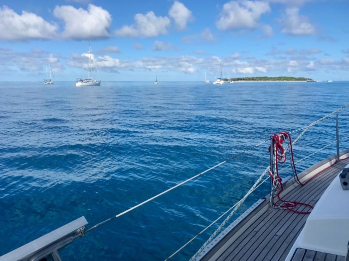 Die folgende Nacht war dann mehr Wind, bis zu 20 Knoten bliesen. Bei Hochwasser hatte dies zur Folge dass es trotzdem recht grosse Wellen bildeten. Auch mit dem hatten wir gerechnet und in der nächsten Nacht würde der Wind noch zunehmen. Somit beschlossen wir schon im Voraus, nach der zweiten Nacht wieder die Insel mit ihrem Korallenring zu verlassen. Der Morgen war dann auch trüb und verhangen – es war nicht mehr der gleiche Charme wie am Tag zuvor! Viele Boote liefen im Verlauf des Morgens aus. Einer nach dem anderen verliess die Lagune. Wir hatten für unser nächstes Etappenziel die «Keppel Islands» ausgewählt. Wir berechneten die Abfahrt um 15 Uhr bei Niedrigwasser und die Ankunftszeit um 7Uhr Morgens. Ein bisschen irritierend war es schon, dass alle schon viel früher ausliefen! Was wussten die was wir nicht wussten, war die Frage! Doch wir glaubten an unseren Plan und hielten uns daran. Eigentlich stellten wir uns vor, nochmals an Land zu gehen oder schnorcheln. Doch es machte uns nicht an, zu wellig und zu windig!