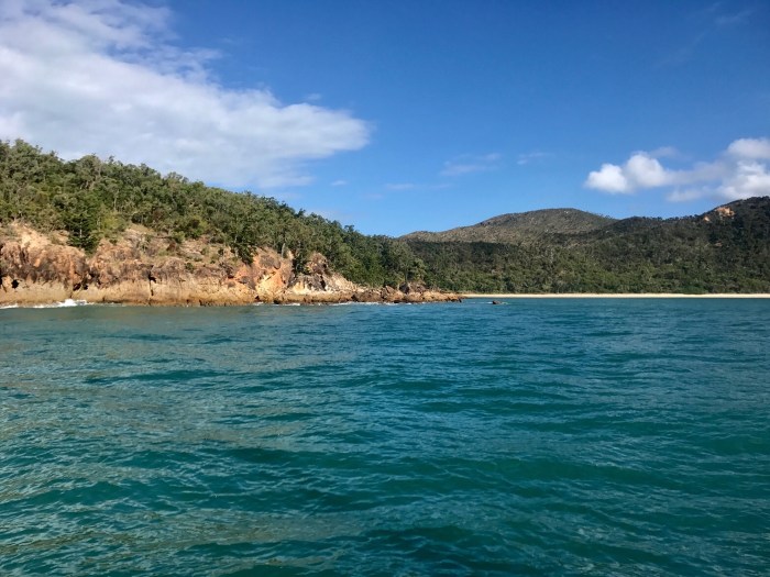 Endlich wieder Sonne und die Fahrt raus zu den berühmten «Whitsundays». Schiffswrack und ein Kakadu, Höhlenmalereien und ein Wasserfall