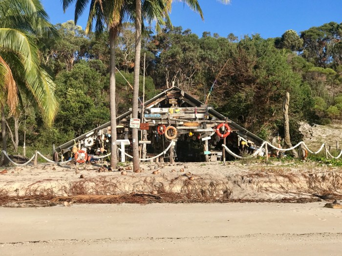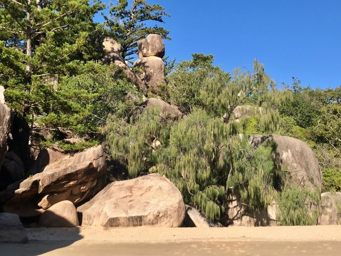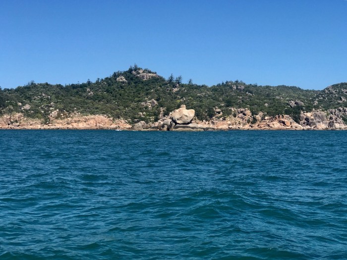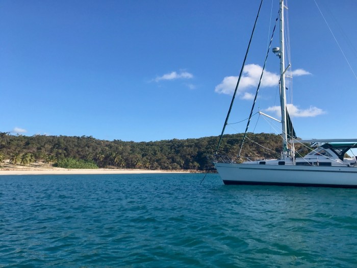Unser Zeil, die Middle Percy Island war 50sm entfernt, also maximal 10h Segelzeit. Wir waren gut unterwegs, genossen die Sonne und den guten Wind und waren auch zügig unterwegs. Um ca 15.30h waren wir in der «West bay» von Percy Island. Was sich vor unseren Augen ausbreitete war einfach super! Eine Bucht wie man sich Robinson Crusoes Bucht vorstellt, mit Palmen und Felsen umsäumt. Ein reicht dekoriertes Gebäude konnte man auch vom Strand ausmachen und das Wasser hatte eine tolle Farbe. Kurz darauf sassen wir im Dinghi und fuhren an Land. Zuerst machten wir aber noch einen Abstecher in die «Lagune». Direkt neben dem Strand gab es eine kleine Durchfahrt wobei man in einen kleinen Salzwassersee mit Mangroven kommt. Zu unserem Erstaunen befanden sich dort zwei Segelboote, an Pfählen festgemacht, dass sie bei Niedrigwasser nicht umfallen. So nach und nach eröffnete sich uns dann, beim Kennenlernen eines weissen, lang und grauhaarigen Inselbewohners, die Vergangenheit und die Geschichte dieser Insel. Wir hätten geplant gehabt, am anderen Tag wieder den Anker zu heben, doch glücklicherweise entschieden wir uns, einen weiteren Tag auf der Insel zu bleiben – es hatte sich gelohnt, wir nehmen die spannendsten Erinnerungen von diesem Ort mit!